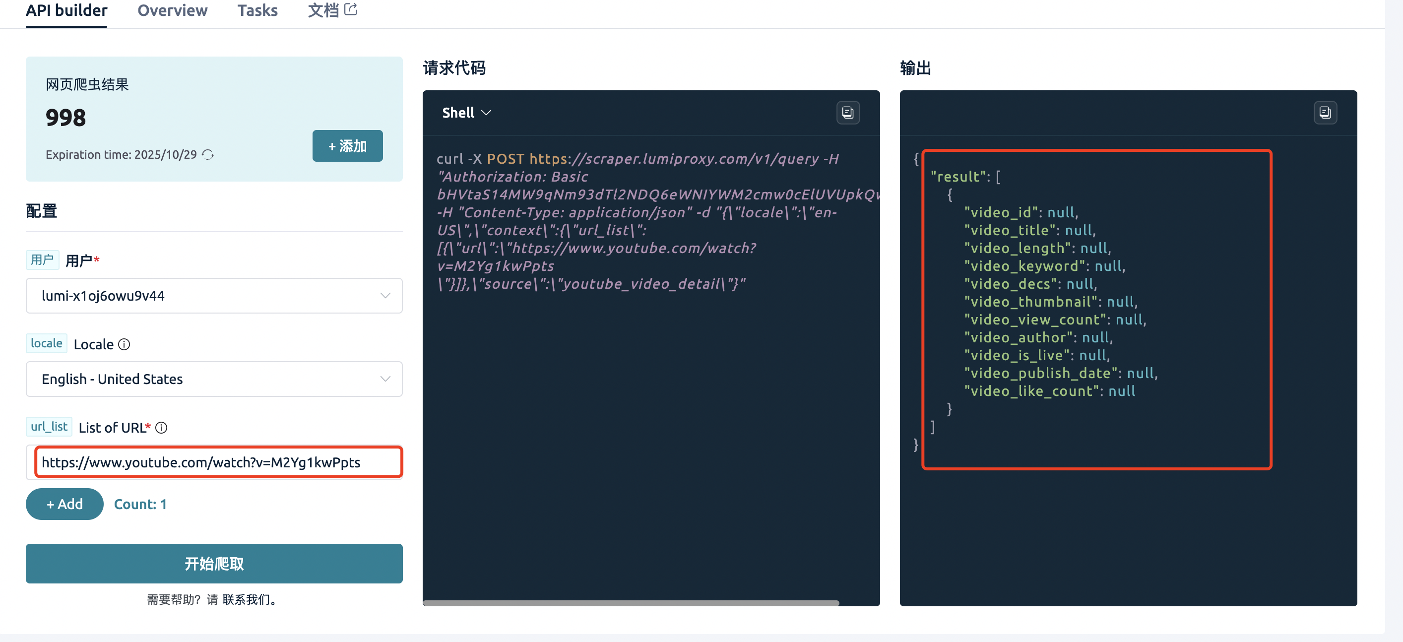 其中对 YouTuBe 提供 6 个抓取 API,包括产品、Token、抓取 URL、分辨率、音频格式、字幕、字幕语言等参数。