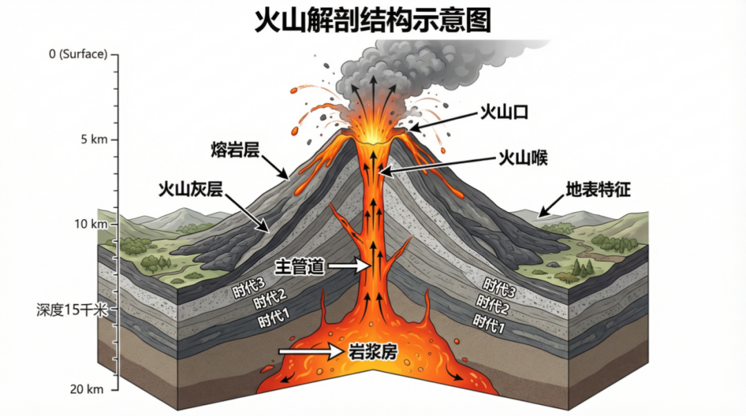 一张精细的火山解剖学横截面信息图,风格类似现代地质学教科书。需清晰标注出:岩浆房、主管道、火山喉、火山口以及不同年代的熔岩与火山灰层。使用箭头指示岩浆流动和火山喷发的过程,所有标注使用简体中文。