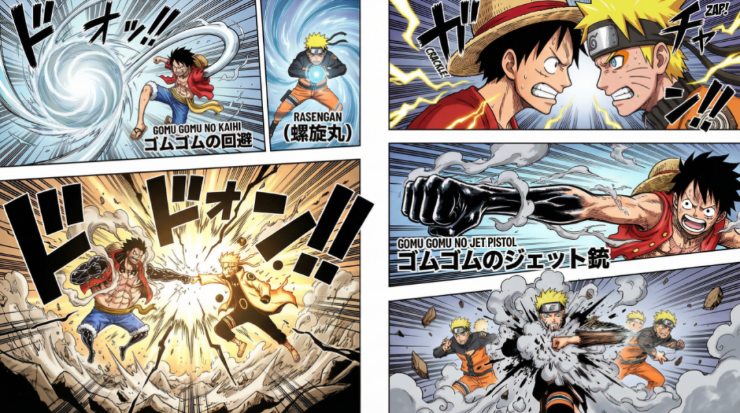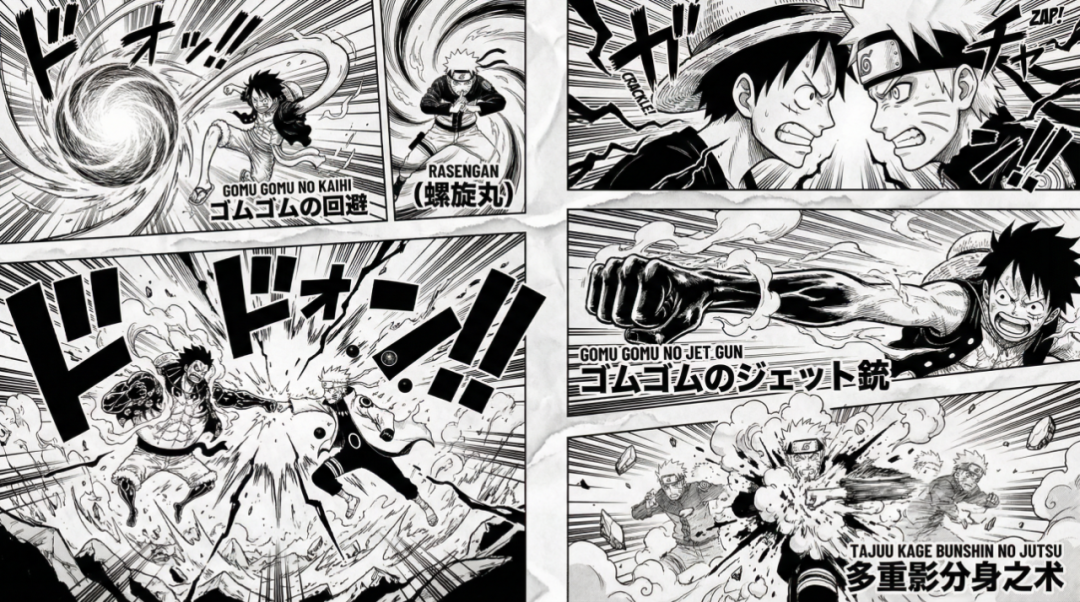 日式少年漫画风格的多分镜页面,描绘《海贼王》路飞与《火影忍者》鸣人的史诗级对决。画面要求具有强烈的动态感和冲击力,使用经典的黑白漫画线条和网点纸效果。