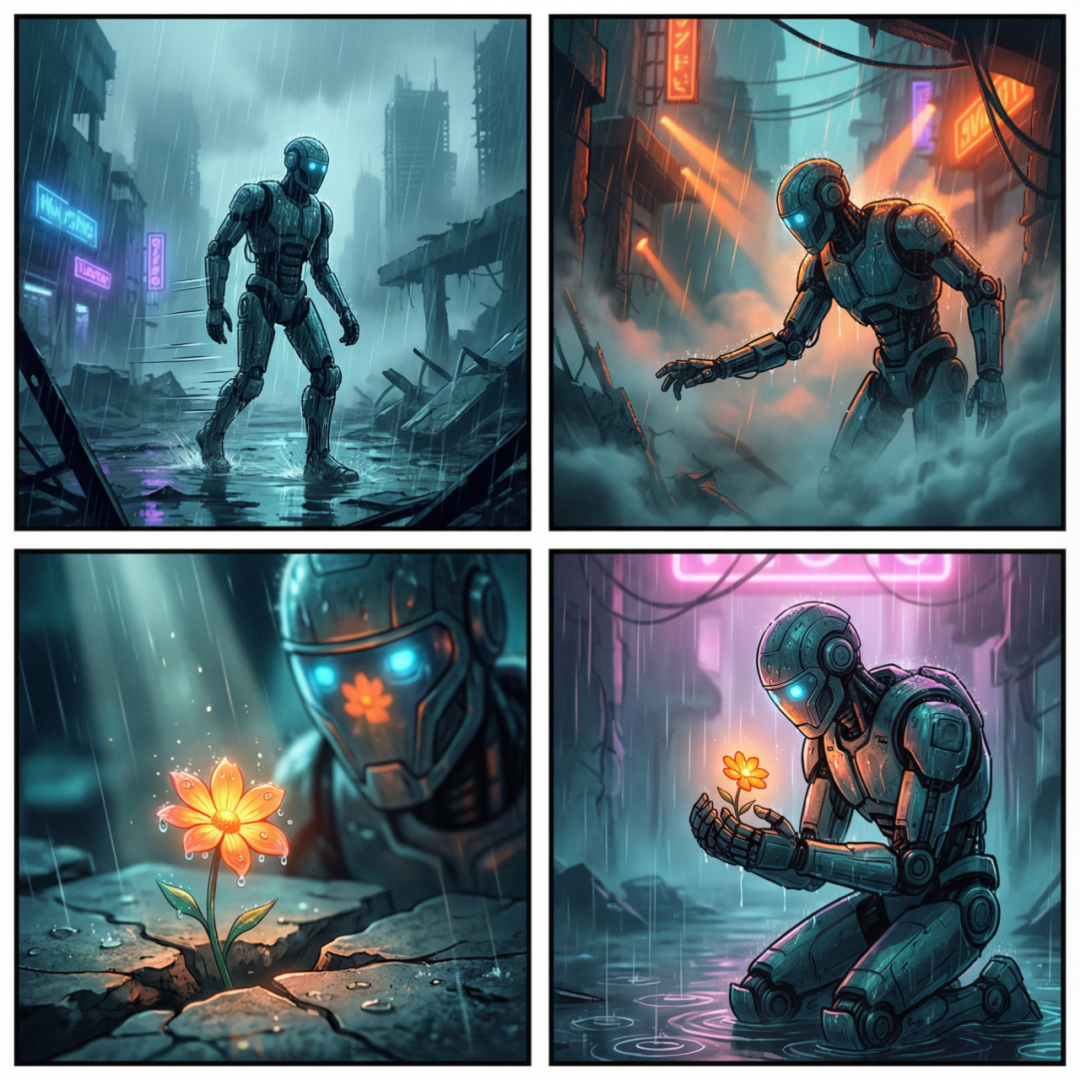 提示词:四格无声漫画,赛博朋克风格,色调参考《银翼杀手》。故事描绘一个机器人在末日废墟中发现一朵有生命的鲜花。重点通过构图、光影和机器人的肢体语言来表达情感,无需文字。