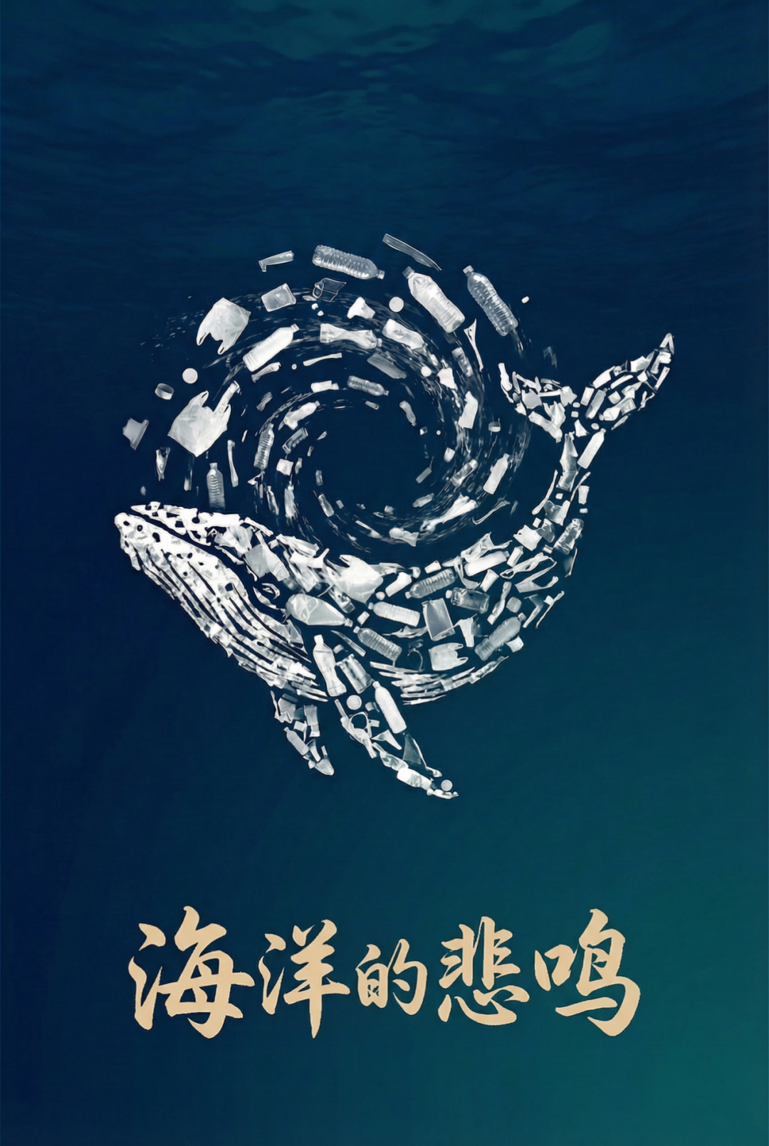 极简主义风格的海洋保护公益海报。主视觉为一只由白色塑料垃圾漩涡构成的鲸鱼,背景为深蓝色海洋。海报底部仅有一行小字:“海洋的悲鸣”,采用带有手写质感的艺术字体,以增强情感共鸣。