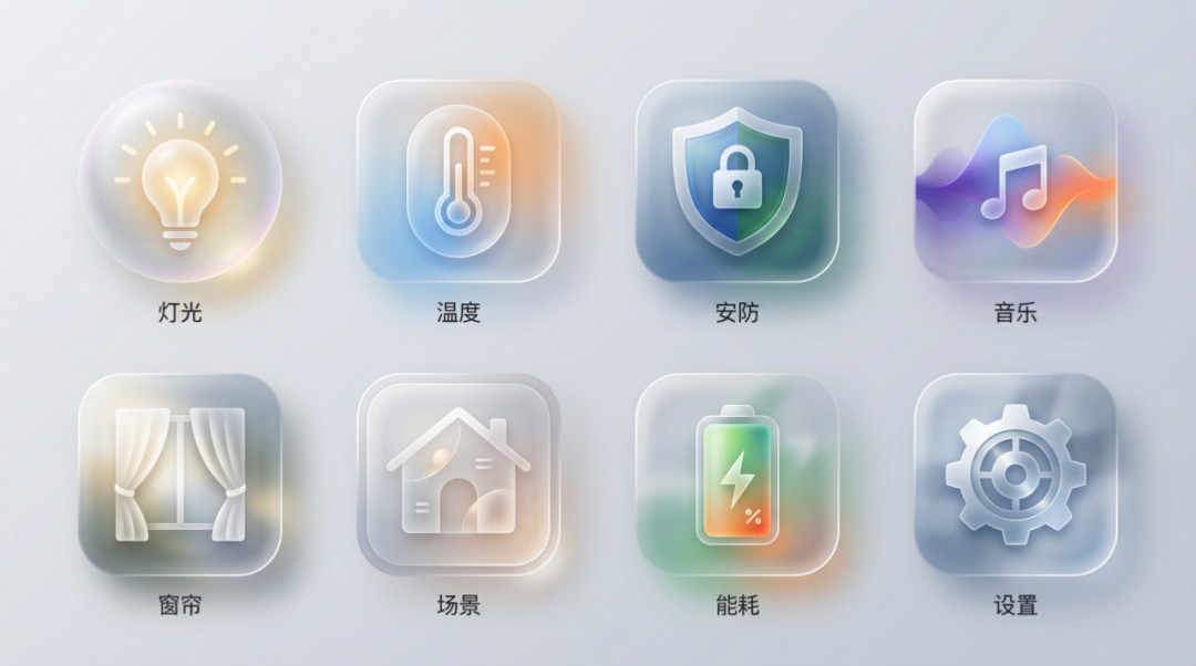 为一款高端智能家居控制App设计8个UI图标,采用毛玻璃(Glassmorphism)风格。图标功能包括:灯光、温度、安防、音乐、窗帘、场景、能耗、设置。