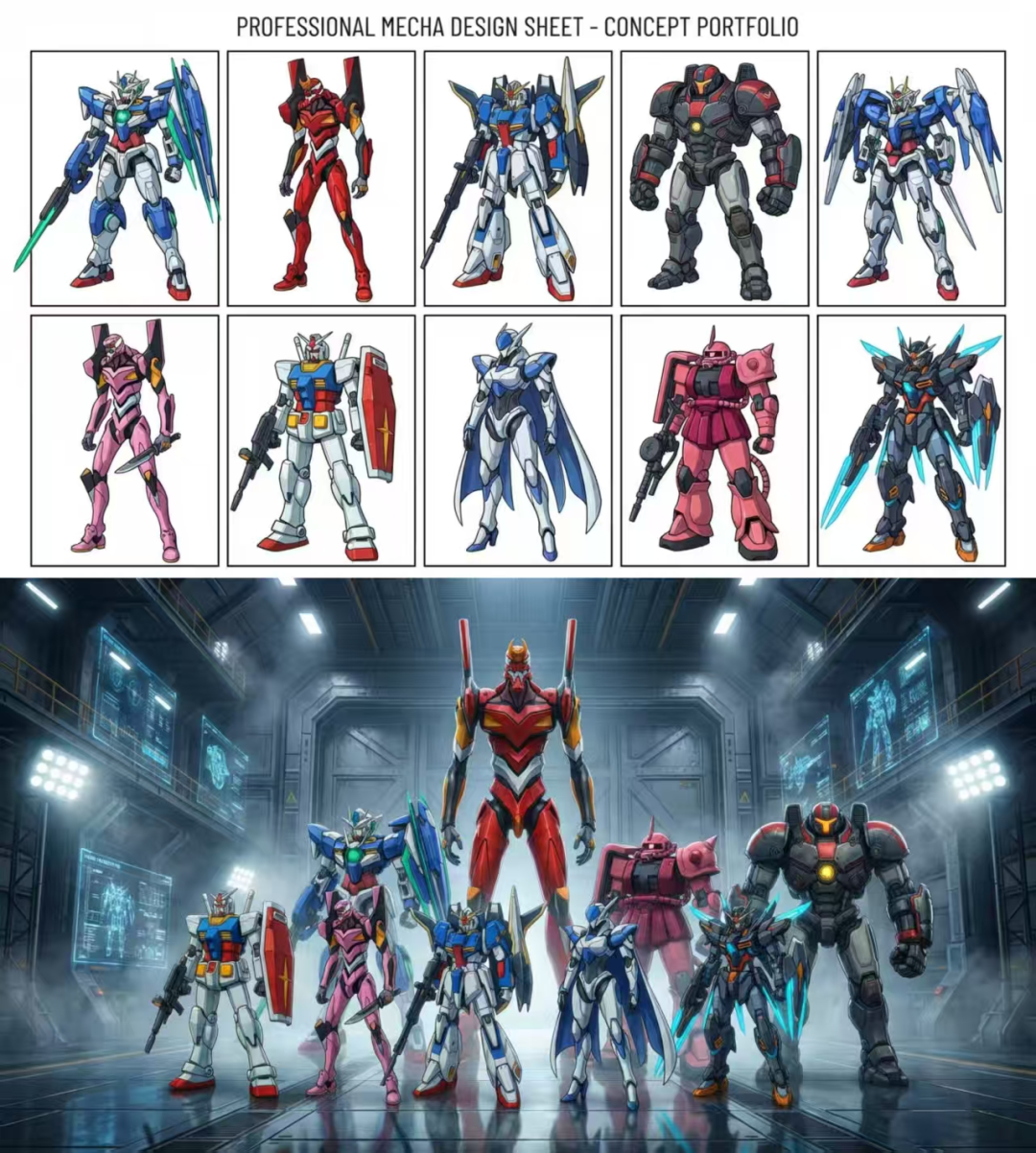 提示词: 【多图融合】请将我提供的10张不同的机甲设定图(包含高达、EVA、扎古、环太平洋机甲等)融合成一张宏大的集体合影。