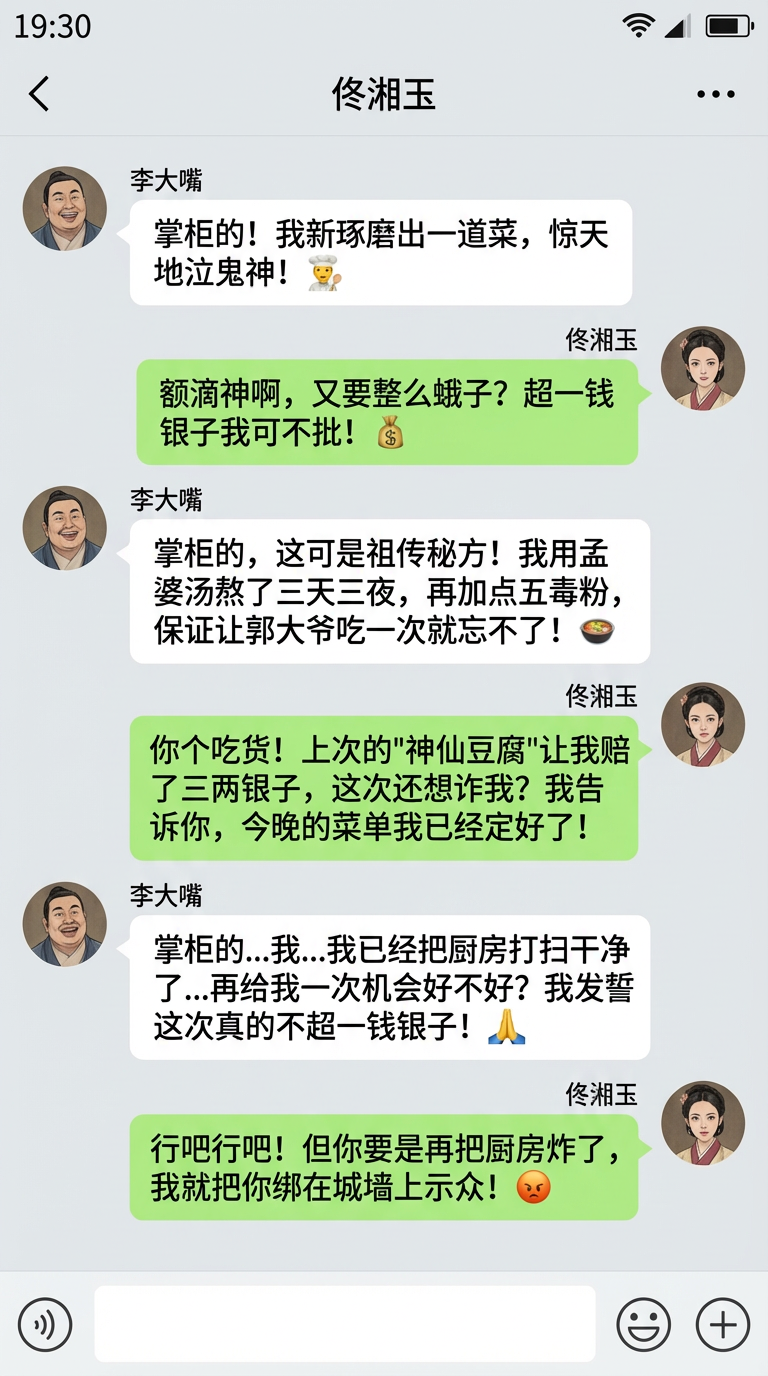 生成一张高清的微信聊天界面截图,模拟《武林外传》角色的对话。聊天主题是“今晚吃啥”,参与者为“掌柜-佟湘玉”和“厨子-李大嘴”。
