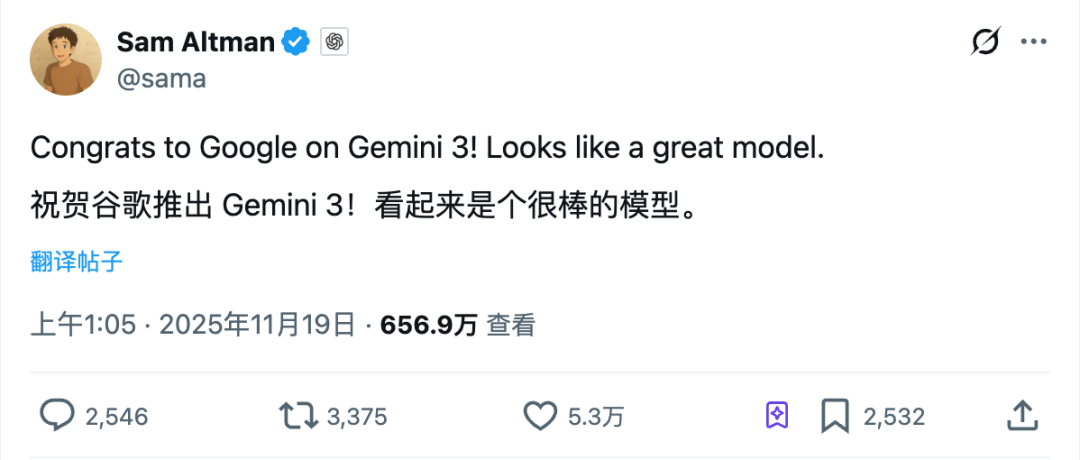 谷歌两个王炸,Gemini 3 和 Nano Banana Pro 炸的山姆奥特曼头昏眼花,忍不住在 X 恭喜谷歌。