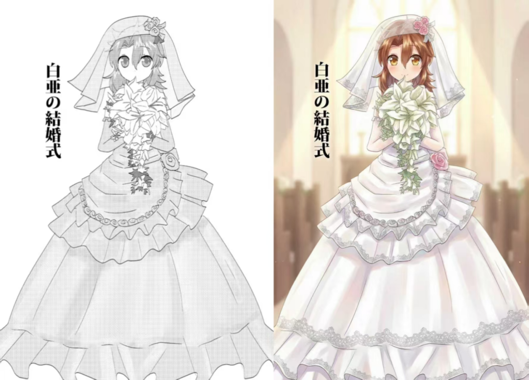 请为这张动漫线稿进行上色。采用光感细腻的现代日系插画风格,色彩清新通透。主要配色:婚纱为纯白色,带有银色蕾丝细节;头发为温暖的栗棕色;眼眸为琥珀色。背景简化为教堂内部,有柔和的光线透入,营造神圣宁静的氛围。请务必保留原始线稿的清晰度和细节。