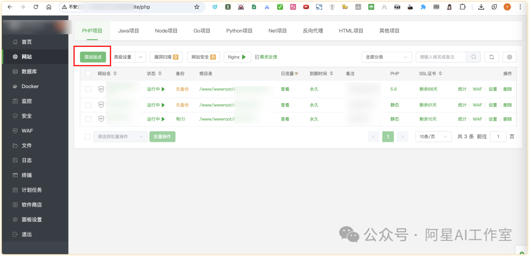 接着我们打开宝塔,新建子站点或者选择你已有的站点就行了。