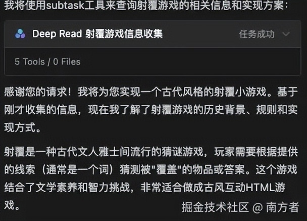 这时候,它发现,目录空的,文件没有的。它就明白了,这是要从 0 开始。它一顿翻阅资料,先了解什么是射覆,射覆的玩法,射覆的规则。