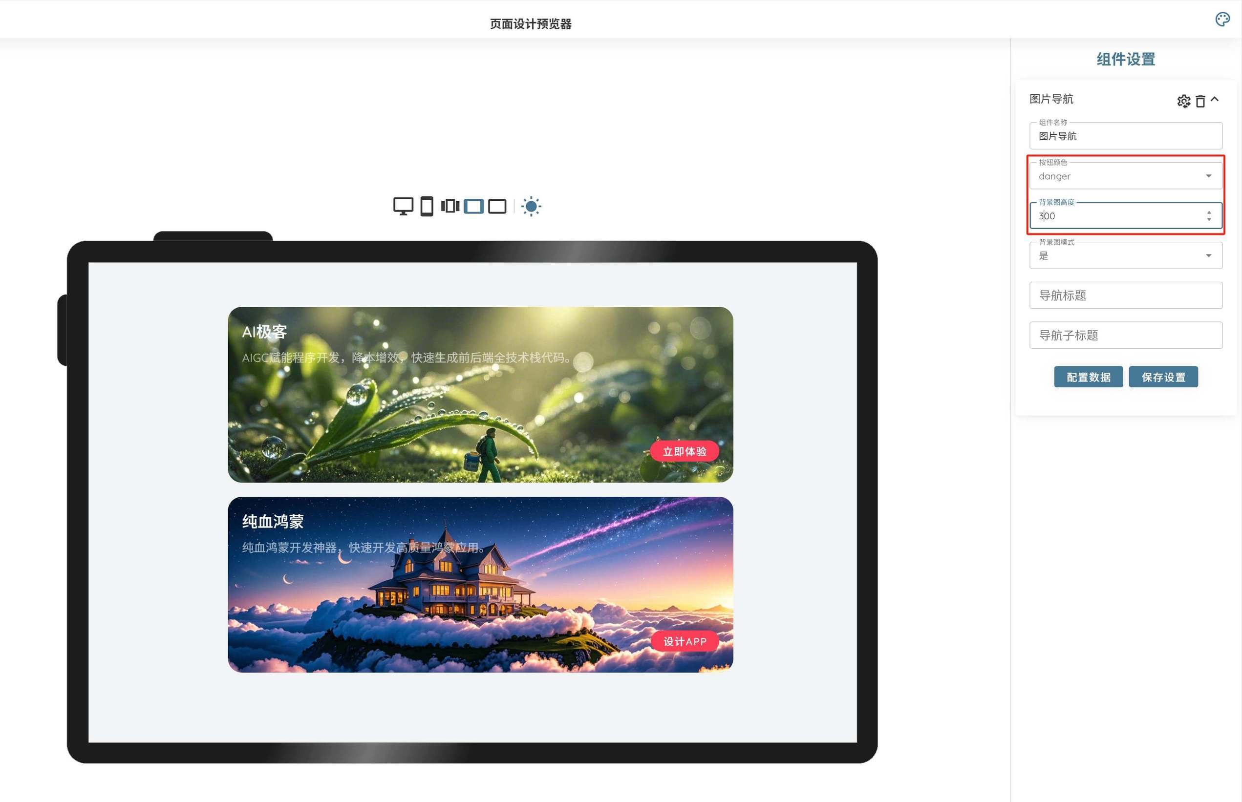 调用示例二: A_ImageNav({ data: [ { text: 'AIGC', src: 'https://cdn.aigcoder.com/sample/ImageNav/pic3.png', router: 'MainTabView' }, { text: '纯血鸿蒙', src: 'https://cdn.aigcoder.com/sample/ImageNav/pic4.png', router: 'OrderList' } ], bgImageMode: false, navTitle: 'AIGC低代码平台', navSubTitle: 'AIGC,纯血鸿蒙', }) */