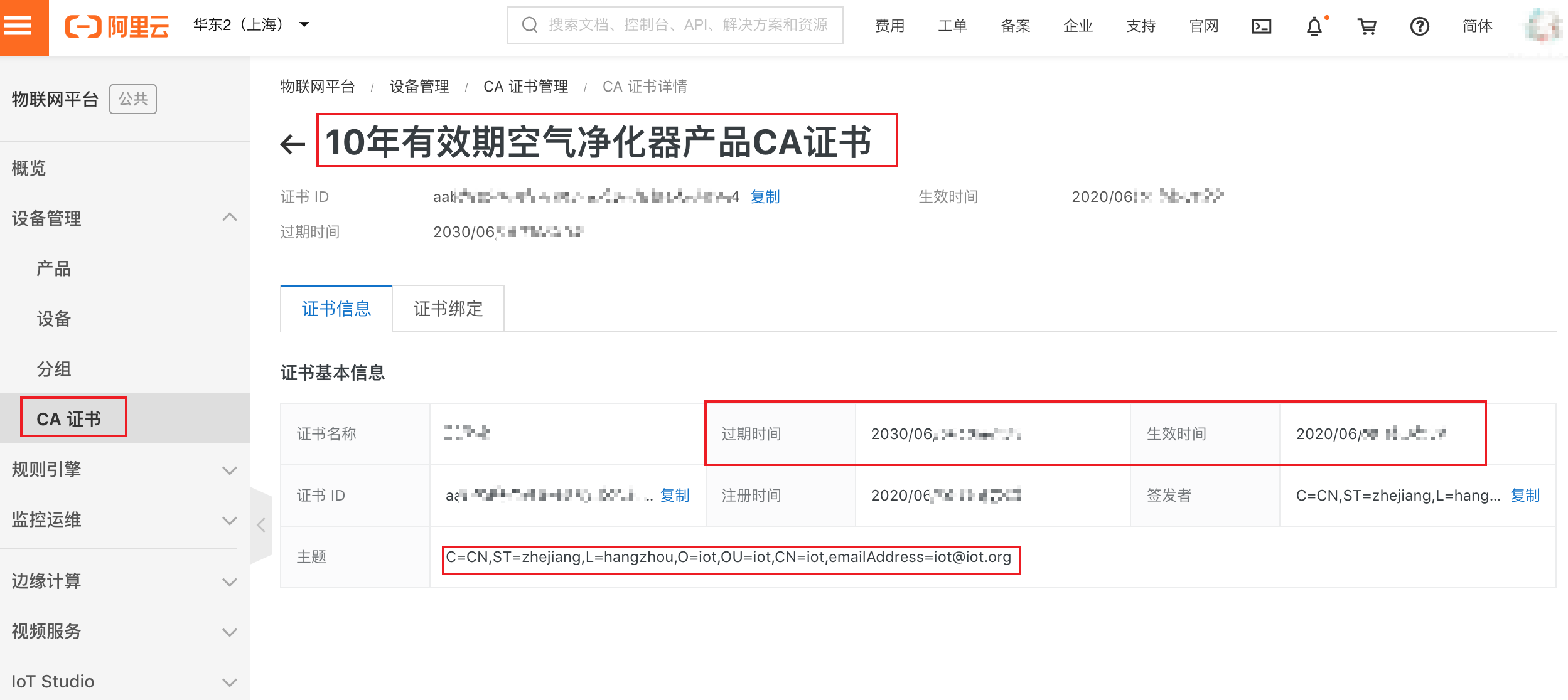 至此,我们完成了私有 CA 证书的制作和在 IoT 物联网平台的注册。后续,就可以用此 CA 证书来签发设备证书了。