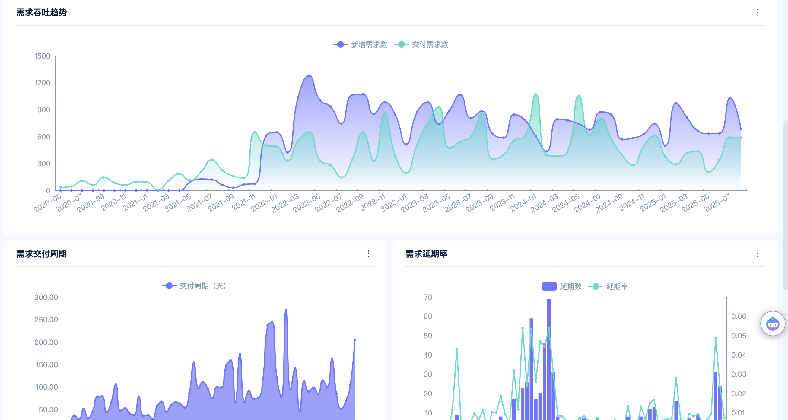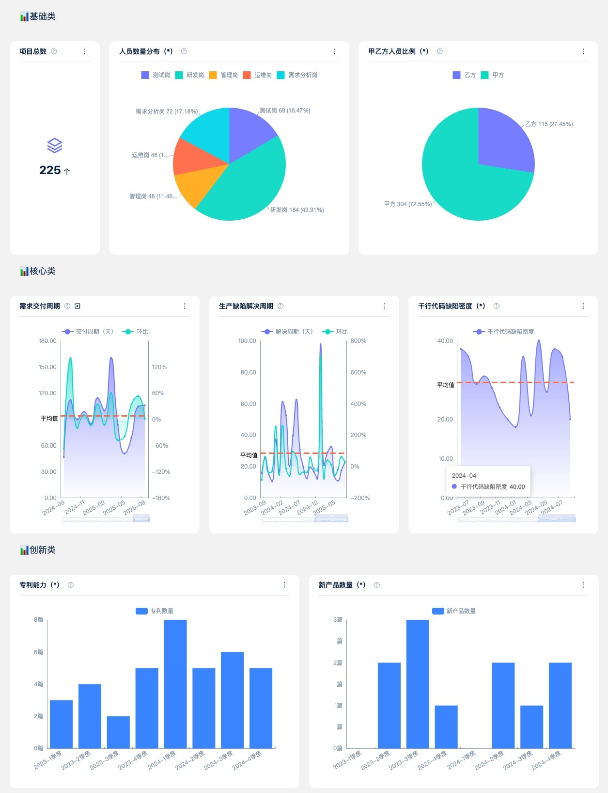 覆盖需求分析岗、系统研发岗、测试执行岗等岗位专属仪表板,贴合基层人员日常工作,度量人员产出质量与效率。