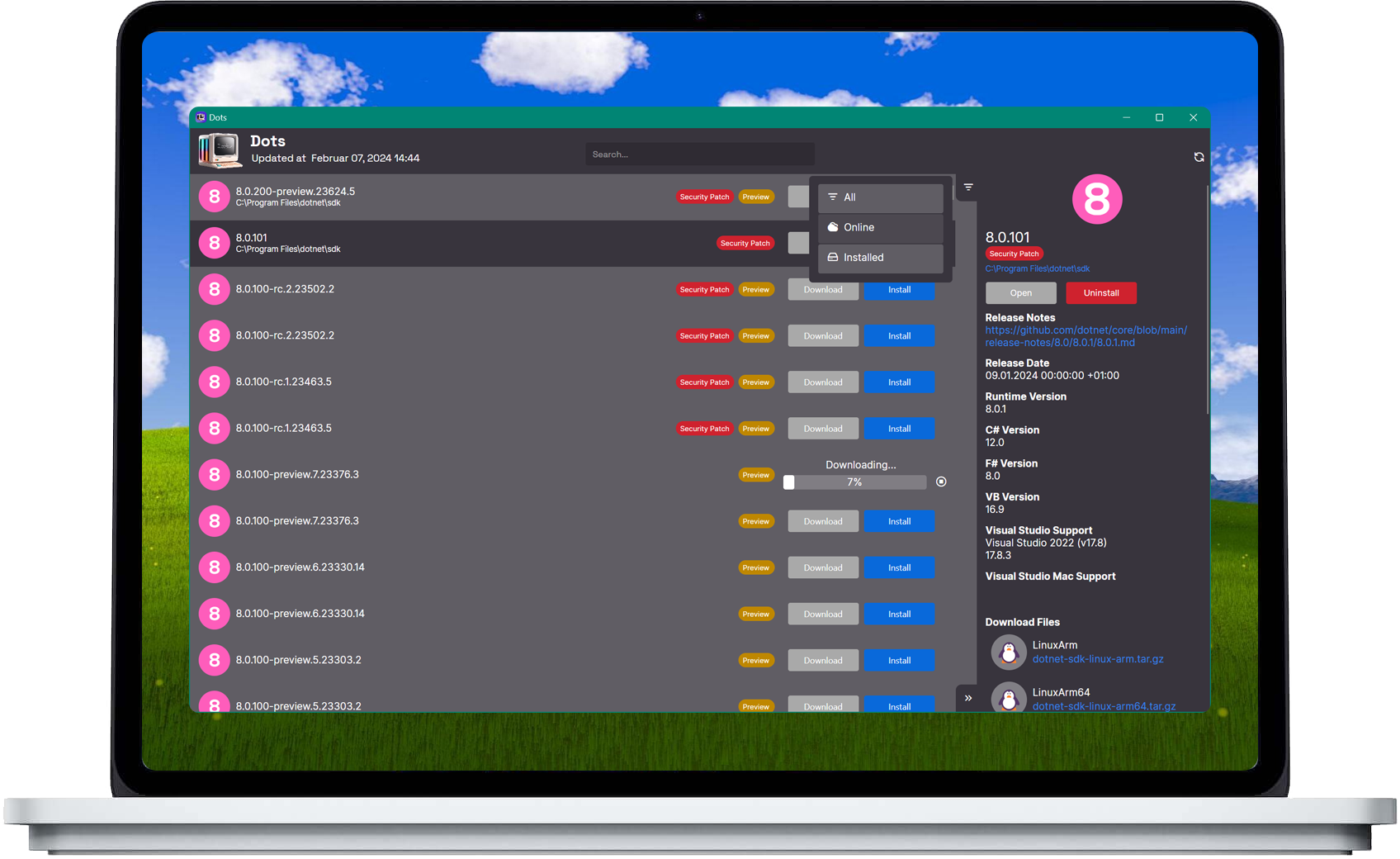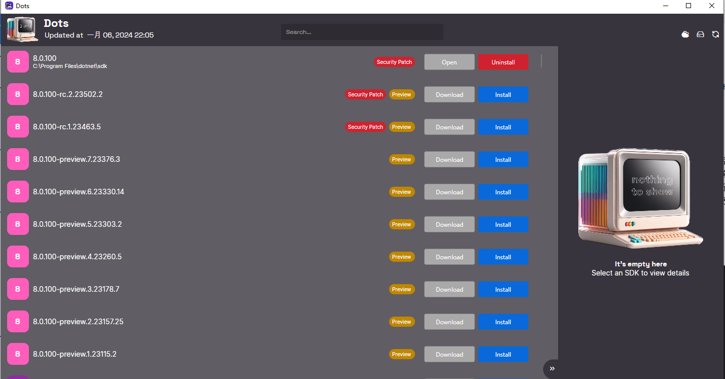 Dots 是一款轻量、友好、跨平台的 .NET SDK 管理工具,可让您轻松安装、卸载和切换 .NET SDK。它是一款跨平台工具,可在 Windows 和 macOS 上运行,即将支持 Linux。它由 C# 编写,使用 Avalonia 作为 .NET UI 框架。