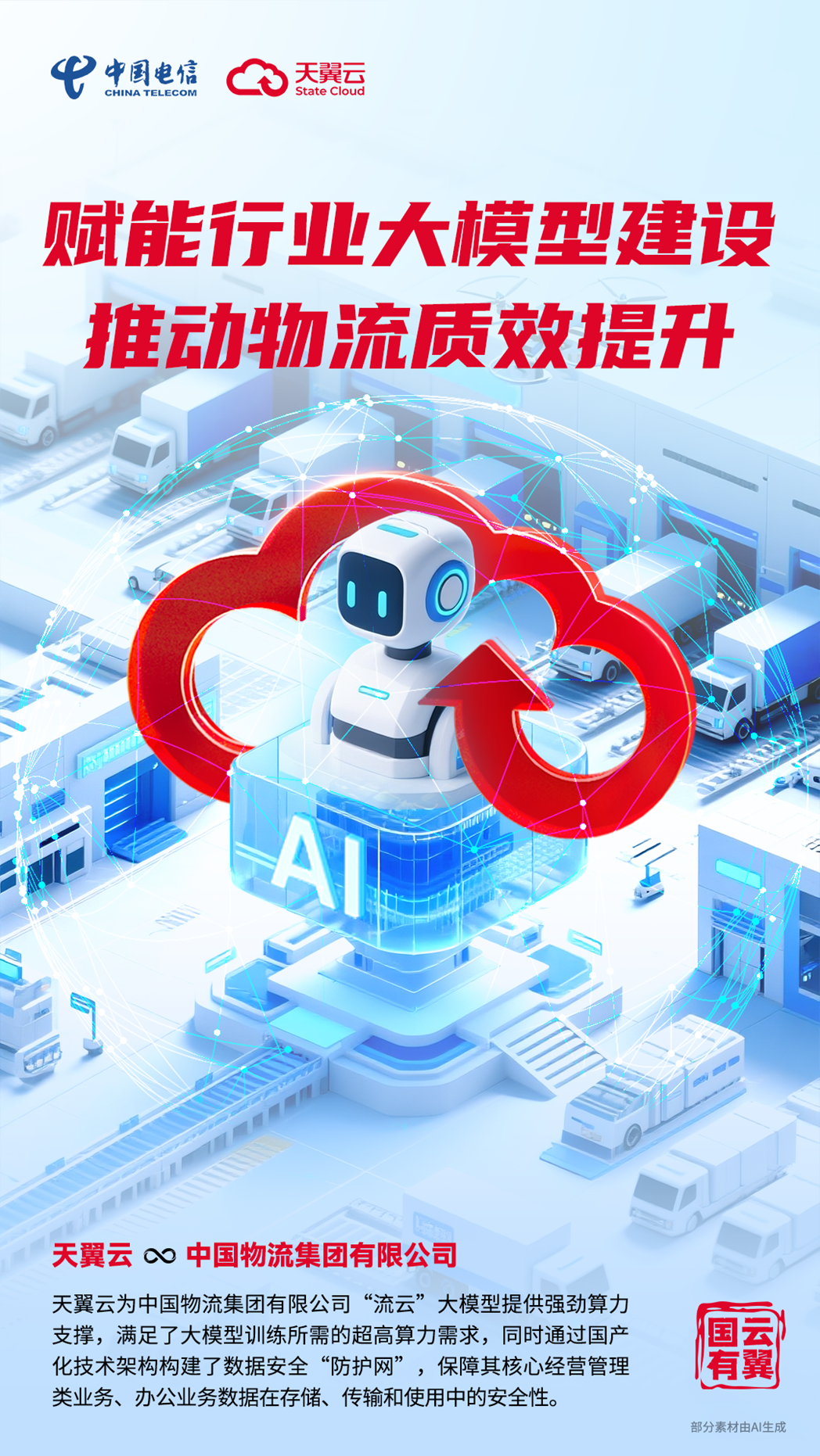 中国物流集团有限公司(以下简称“中国物流”)是国务院国资委直接监管的股权多元化国有全资中央企业,致力于打造“成为具有全球竞争力的世界一流综合性现代物流企业集团”。作为物流行业的“国家队”,中国物流积极把握人工智能发展方向,与中国电信等合作伙伴共同研发、上线 2780 亿参数“流云”大模型,有力推动了物流行业数智化升级与“人工智能+”生态发展,为降低全社会物流成本提供了强有力的技术支撑。天翼云作为云服务国家队,为“流云”大模型提供了强劲算力支撑,不仅助力中国物流成功实现数字化转型,也为整个物流行业智能化发展树立了央企新标杆。