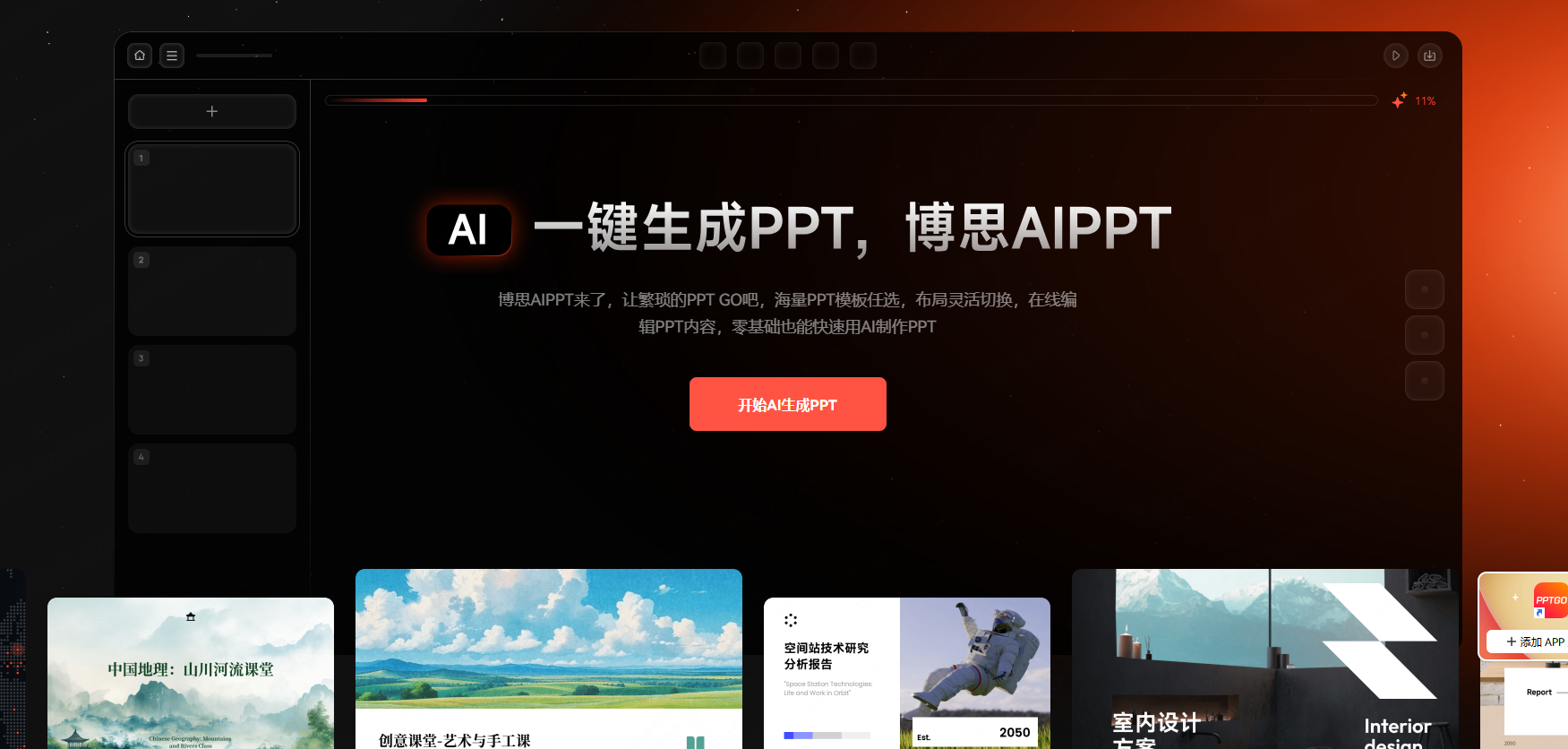 博思 AIPPT 是一款将 AI 技术与演示文稿创作深度融合的 ppt 软件电脑版。它致力于将用户从繁琐的排版和设计工作中解放出来,通过强大的 AI 引擎,实现从内容构思到精美呈现的全流程智能化。博思 AIPPT 的设计理念是让每个人都能轻松创作出专业级别的演示文稿,无论你是否具备设计背景。