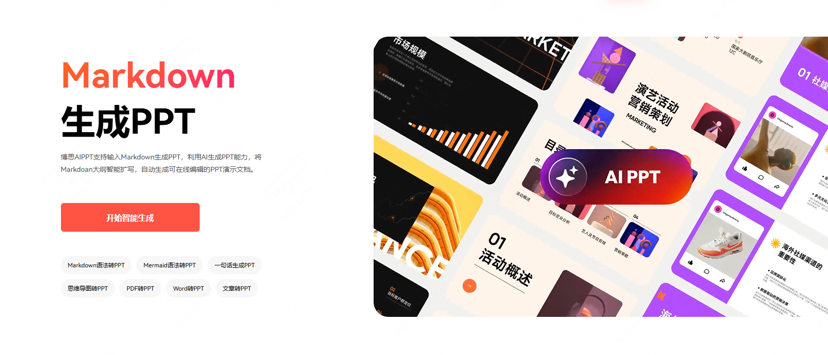 Markdown/Word 文档生成 PPT:对于已经有现成文字材料的用户,这个功能堪称神器。你可以直接将写好的 Word 文档、Markdown 文档、甚至是 PDF 或 TXT 文件导入博思 AIPPT。它能够智能解析文档的结构,自动识别标题层级和段落内容,并将其精准地映射到 PPT 的页面结构中,瞬间将静态的文字转化为动态的演示文稿,省去了大量复制粘贴和格式调整的时间。