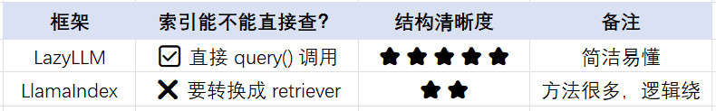 与某些“拐弯抹角”的框架(比如 LlamaIndex)不同,LazyLLM 的索引就是索引,不用绕来绕去把 Index 变成什么 retriever 或 query_engine,再倒回来才能用。逻辑直白,工程师狂喜!