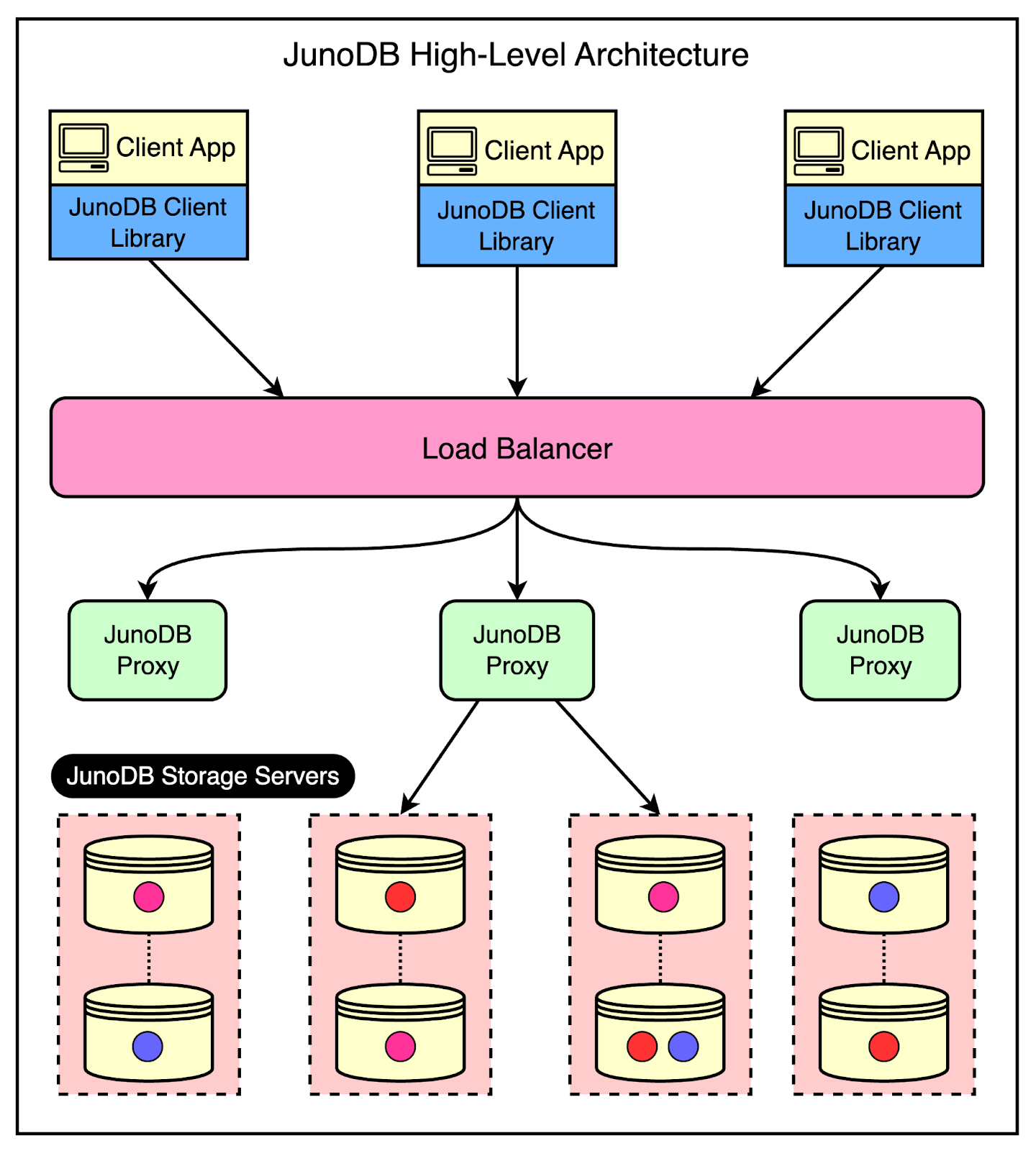 该架构由三个主要组件组成:JunoDB 客户端库、JunoDB 代理和 JunoDB 存储服务器。