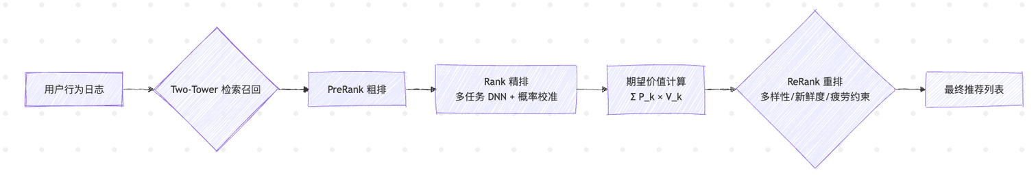 召回(Recall)阶段通过 Two-Tower 模型快速检索语义相似的视频;