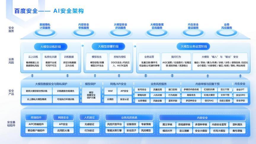 大模型技术的深度应用在释放生产力的同时,也潜藏着多重安全隐患。一旦保护不到位,可能导致用户隐私泄露,甚至被用于诈骗、盗用身份等违法犯罪活动。技术开发过程中,若核心数据或算法被窃取,不仅损害企业利益,还可能被不法分子篡改功能,导致模型输出错误结果,影响医疗、金融等关键领域。这些风险不仅威胁企业及个人权益,还可能破坏社会信任,甚至影响国家安全。因此,需要通过加强数据保护、完善技术架构、制定行业规范等多方面措施,以确保大模型在安全可控的前提下发挥作用。为此,百度提出了大模型安全护栏建设理念,为行业提供了一套系统性的内生安全解决方案,构建功能完备、服务全面的大模型安全护栏产品矩阵,针对大模型场景存在的各类风险,提供一站式的大模型输入、输出安全护栏产品。