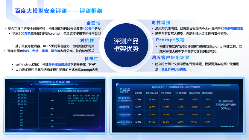 与此同时,百度将大模型安全评测体系视为保障安全的“生命线”。该体系由海量高质量评测数据集与全流程自动化评测系统构成,不仅全面覆盖通用场景及垂直领域智能体,更能持续吸纳时下最新的风险事件与对抗性样本,保持题库的鲜活性与高对抗性。针对传统人工评测成本高、标准不一的痛点,该体系的核心创新在于引入了微调后的“裁判大模型”进行自动化标注,其准确率已高达 95%以上,显著优于人工水平。通过对待测模型的例行化访问与深度评估,系统能快速生成精准报告,为合作伙伴提供科学、高效的安全水位评估,确立模型上线前的最后一道安全防线。