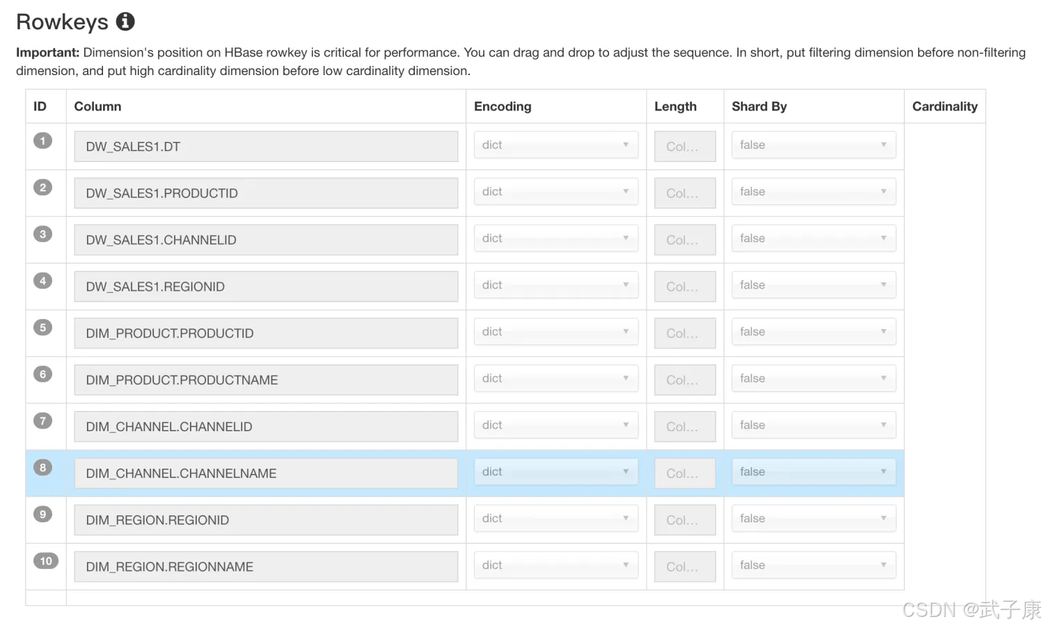 各维度在 RowKeys 中的顺序,对于查询的性能会产生较明显的影响,在这里用户可以根据查询的模式和习惯,通过拖拽的方式调整各个维度在 RowKeys 上的顺序,推荐的顺序为: