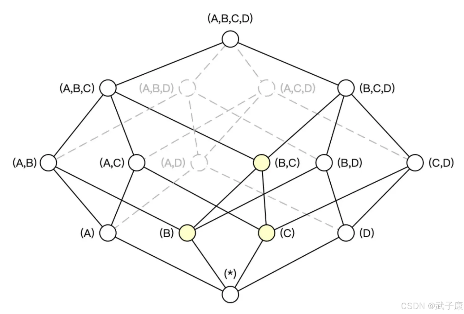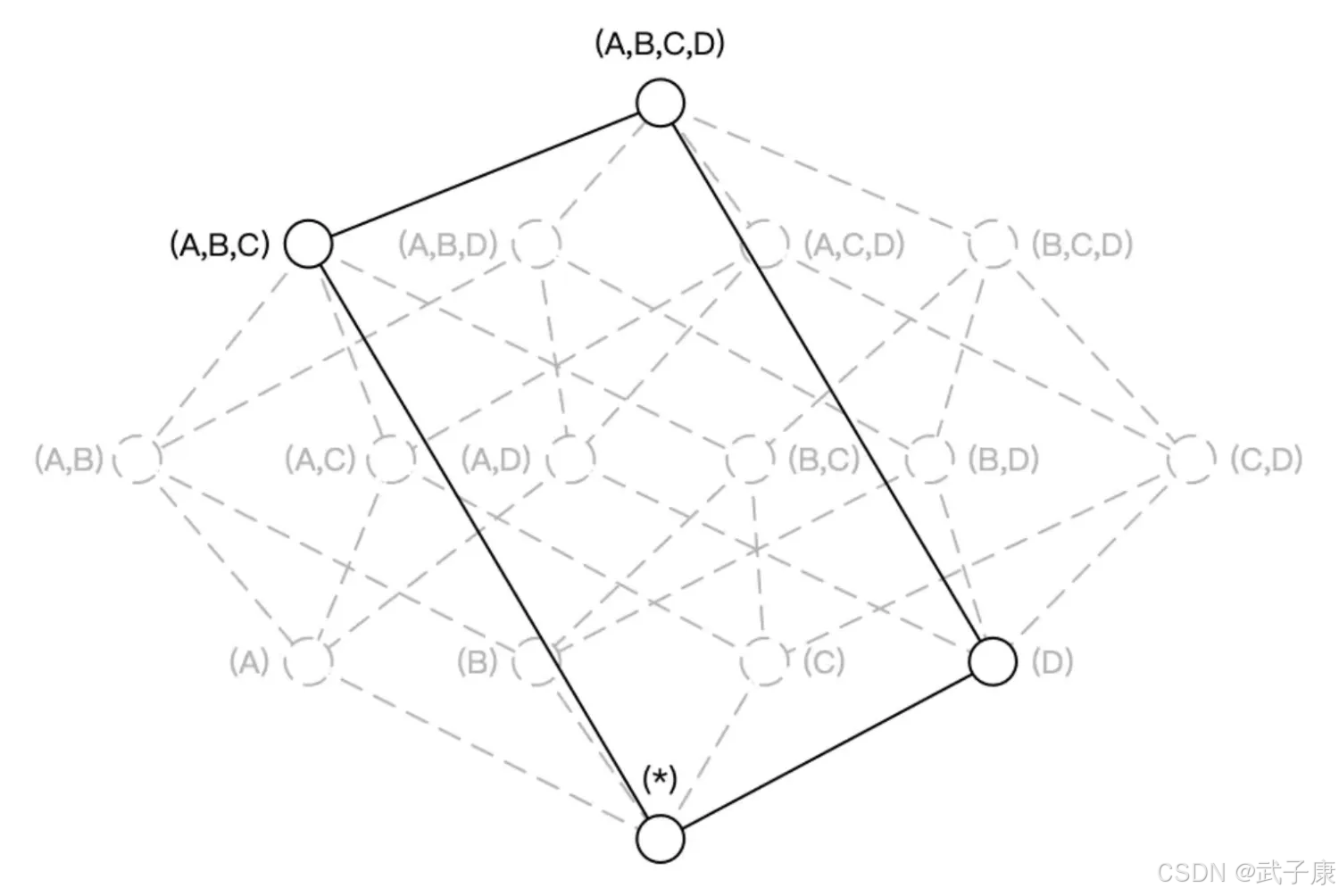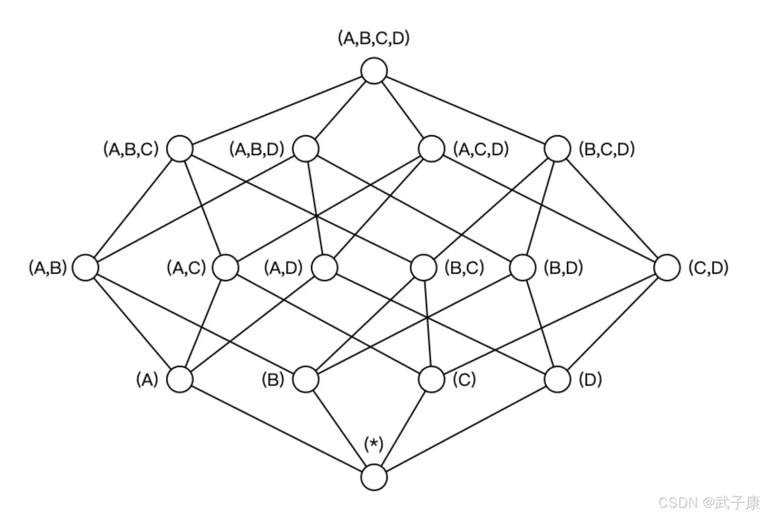 在单个组合组中,可以对维度设置一些高级属性,包括强制思维、层级维度、联合维度。一个维度只能出现在一个属性组中。构建 N 个维度的 Cube 会生成的 2^N 个 Cuboid,如下图所示,构建一个 4 个维度(A、B、C、D)的 Cube,需要生成 16 个 Cuboid。