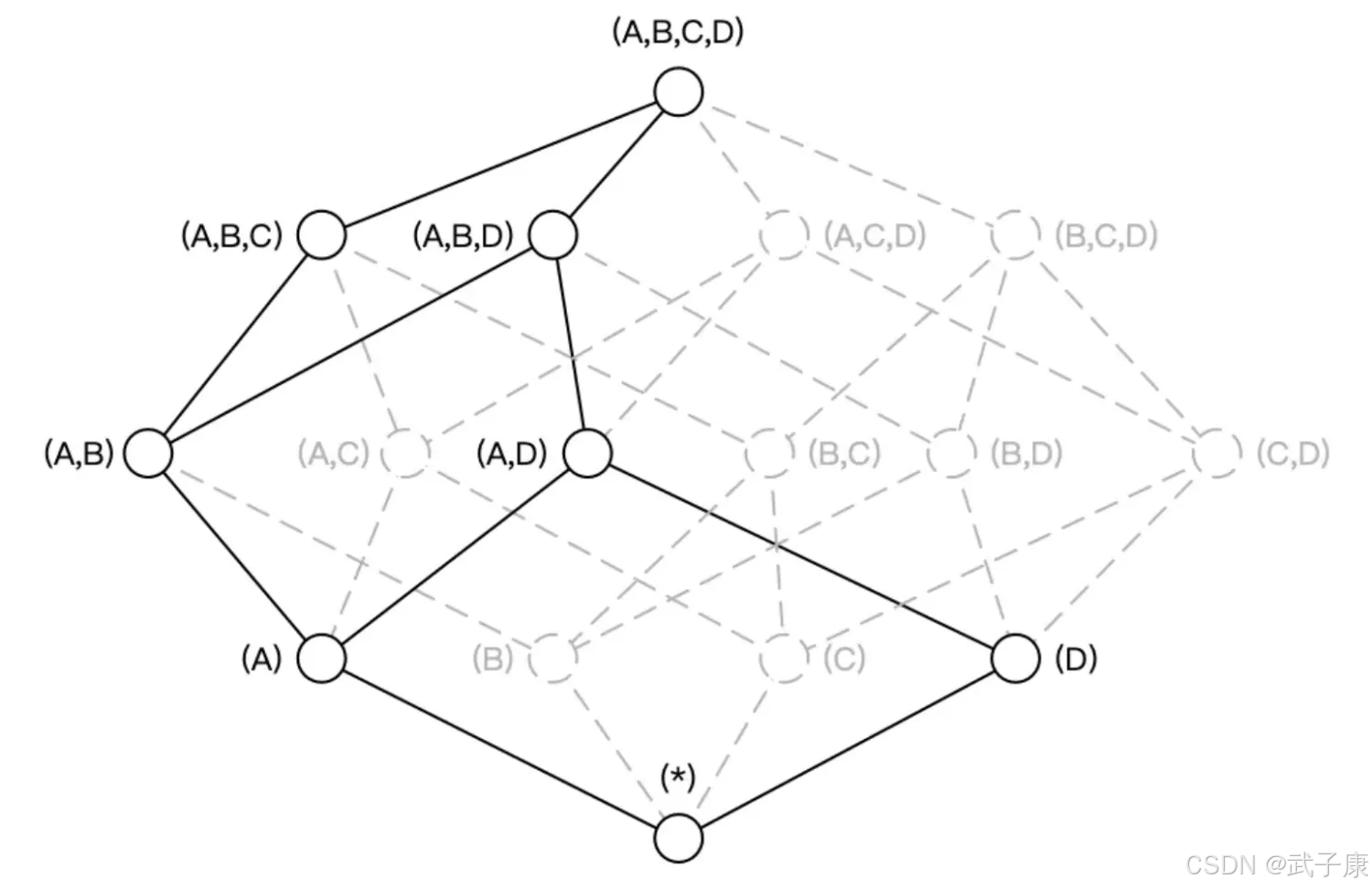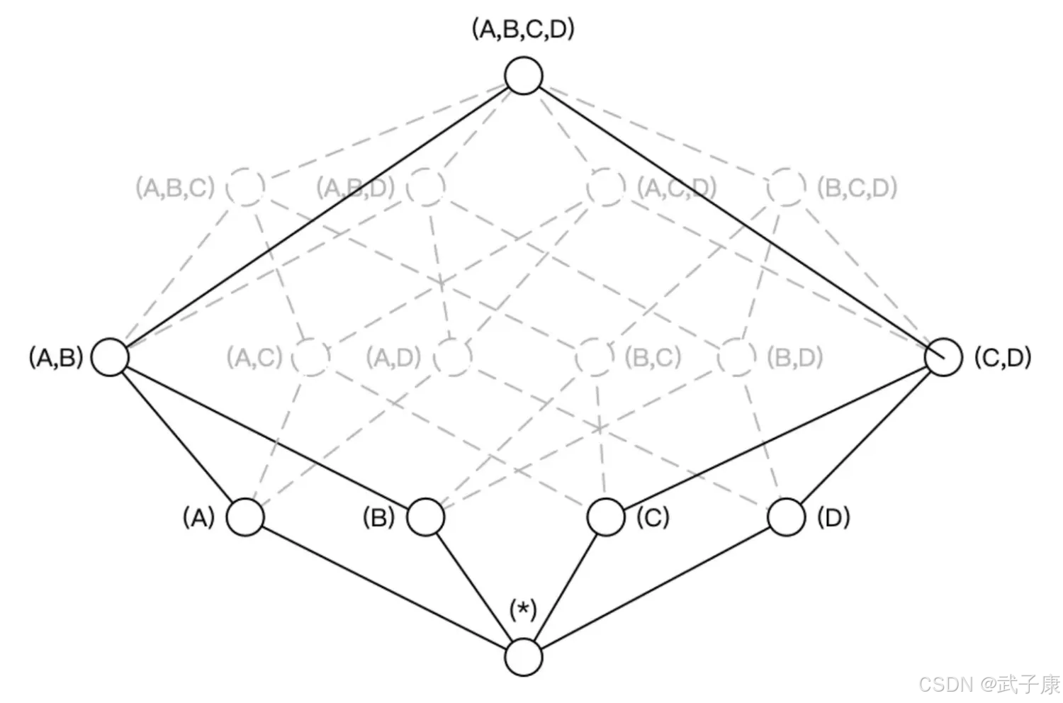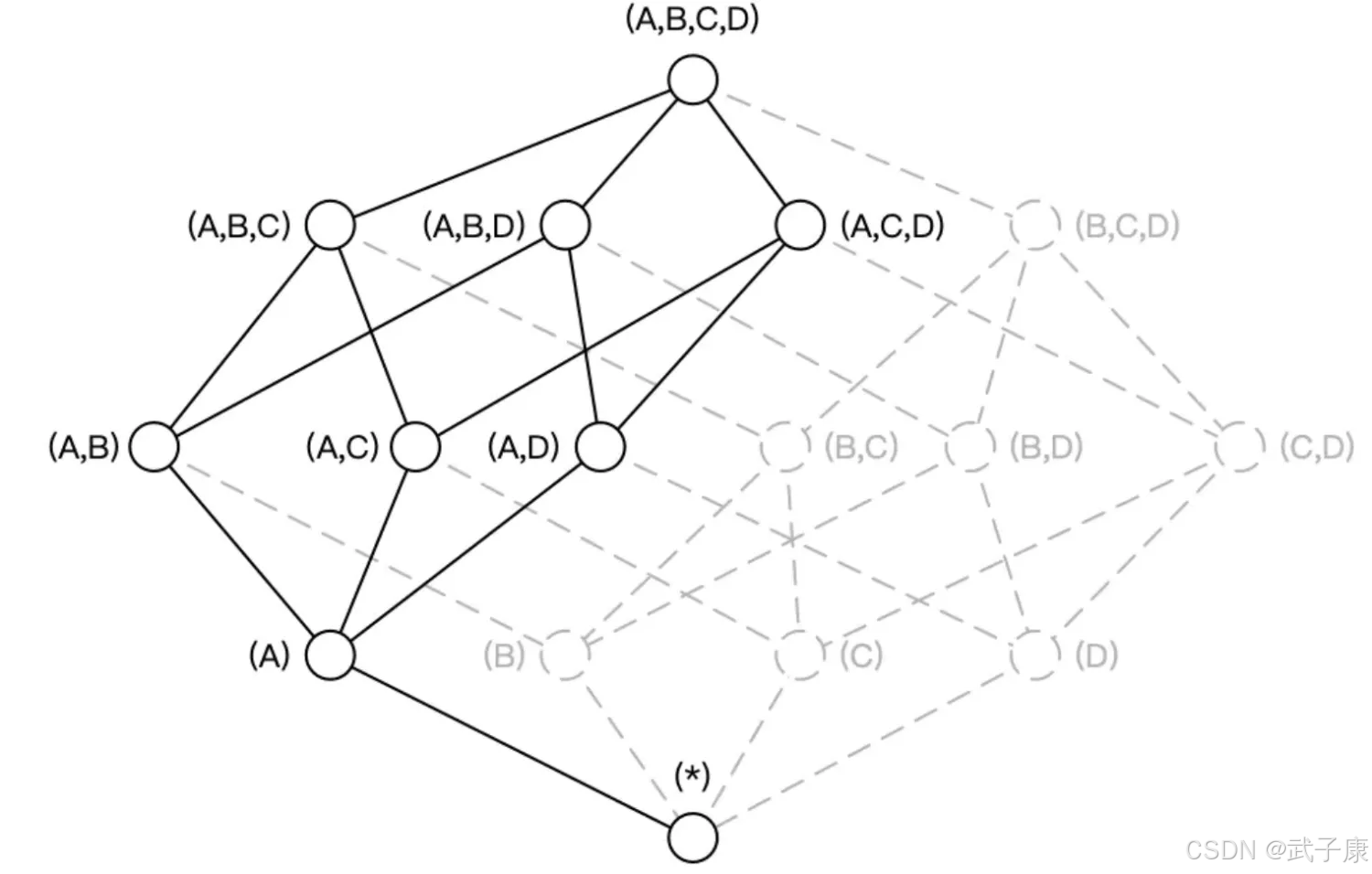 在单个组合组中,可以对维度设置一些高级属性,包括强制思维、层级维度、联合维度。一个维度只能出现在一个属性组中。构建 N 个维度的 Cube 会生成的 2^N 个 Cuboid,如下图所示,构建一个 4 个维度(A、B、C、D)的 Cube,需要生成 16 个 Cuboid。