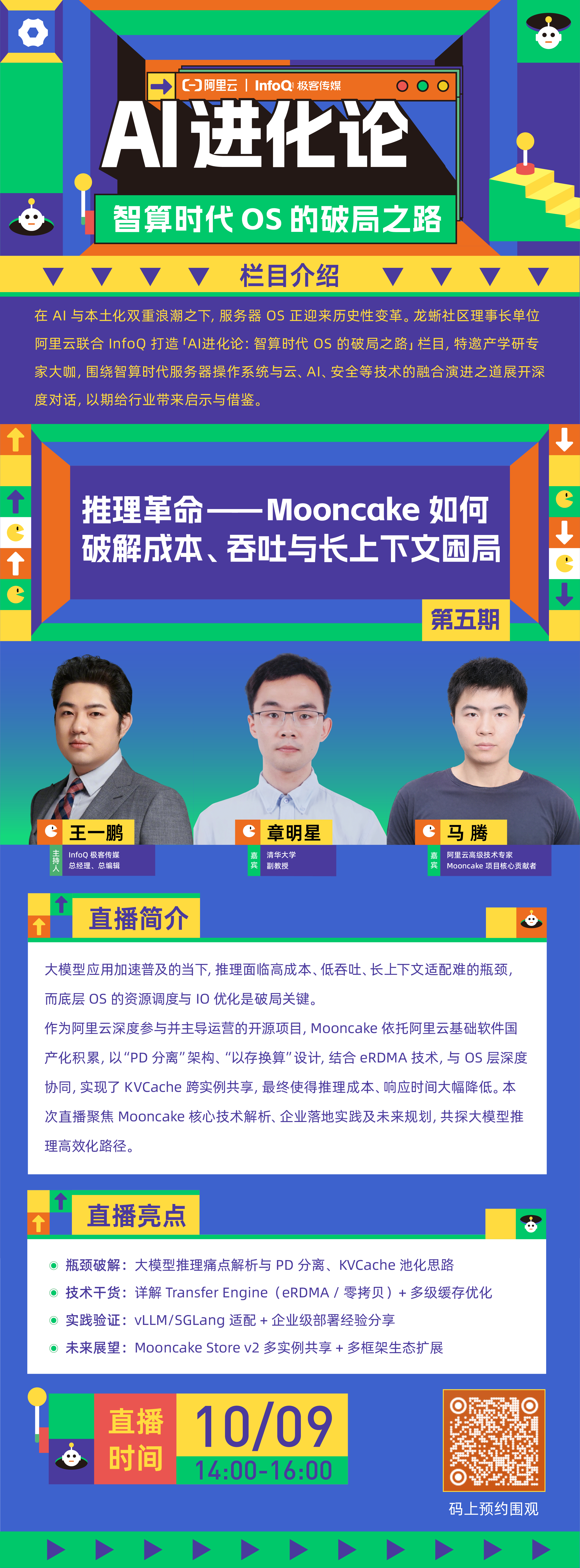 大模型应用加速普及的当下,推理面临高成本、低吞吐、长上下文适配难的瓶颈,而底层 OS 的资源调度与 IO 优化是破局关键。《AI 进化论:智算时代操作系统的破局之路》系列直播第五期将于 10 月 9 日 14:00 开始,特别邀请到清华大学副教授章明星,阿里云高级技术专家、Mooncake 项目核心贡献者马腾,InfoQ 极客传媒总经理、总编辑王一鹏三位嘉宾,围绕 “推理革命——Mooncake 如何破解成本、吞吐与长上下文困局” 这一主题展开深度探讨,聚焦 Mooncake 核心技术解析、企业落地实践及未来规划,共探大模型推理高效化路径。