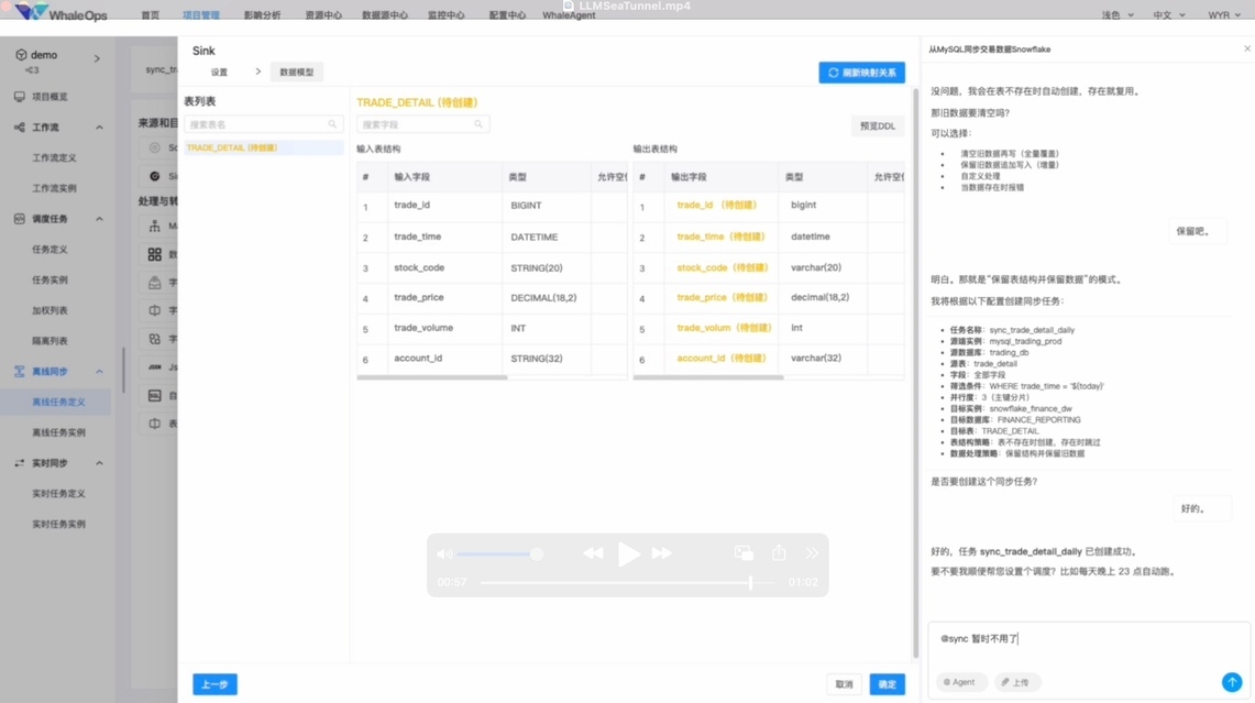 在数据同步中,它能将自然语言 Prompt 自动生成 WhaleTunnel 配置文件,智能推断字段映射与增量策略,自动生成配置后,进入图形界面,直观验证与微调 DAG,实现 Prompt 到数据同步任务的平滑过渡。