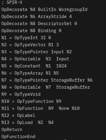 pub fn init(&mut self) { //初始化 let ty_vec3 = self.get_type(Type::Vec(Rc::new(Type::U32), 3)); let ty_pt = self.builder.type_pointer(None, StorageClass::Input, ty_vec3); let wgid = self.builder.variable(ty_pt, None, StorageClass::Input, None); self.builder.decorate(wgid, Decoration::BuiltIn, vec![rspirv::dr::Operand::BuiltIn(spirv::BuiltIn::WorkgroupId)]); self.builtins.push(wgid); }