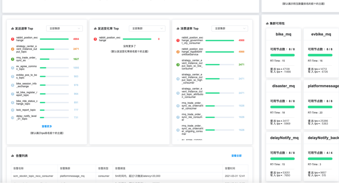 实时告警:对消费积压、发送/消费速度、节点掉线、分区不均衡进行实时告警通知。