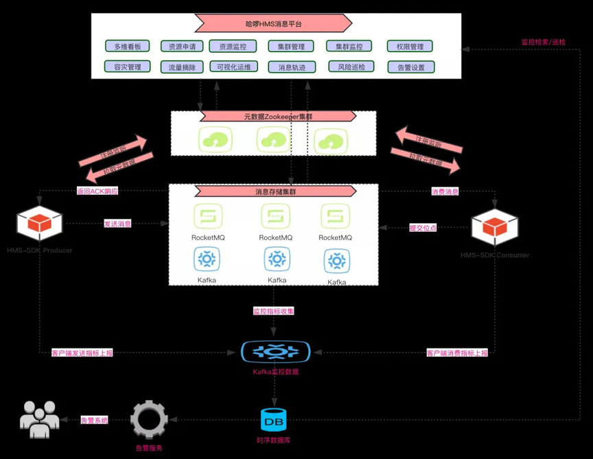 旨在屏蔽底层各个中间件( RocketMQ / Kafka )的复杂性,通过唯一标识动态路由消息。同时打造集资源管控、检索、监控、告警、巡检、容灾、可视化运维等一体化的消息治理平台,保障消息中间件平稳健康运行。