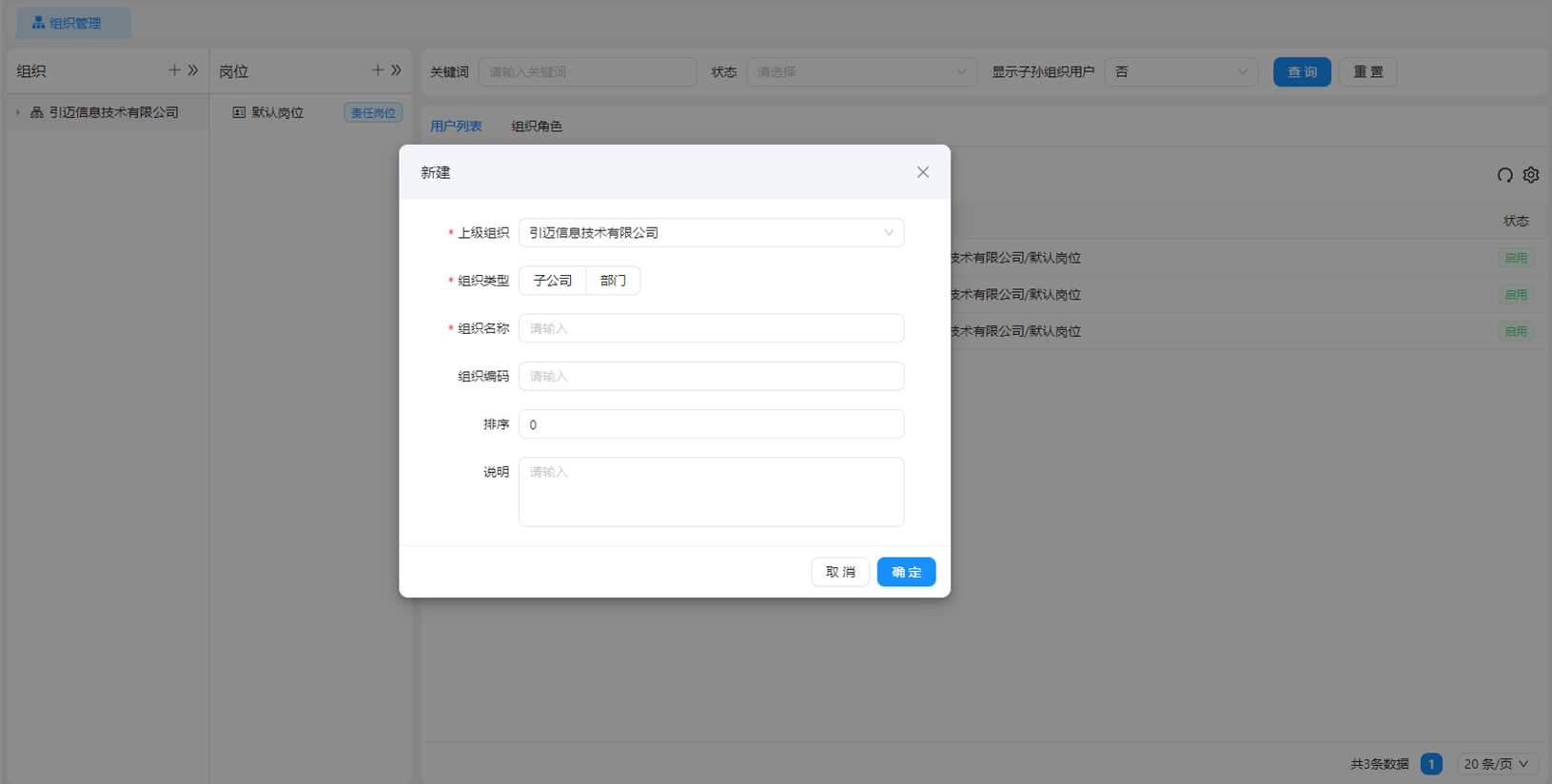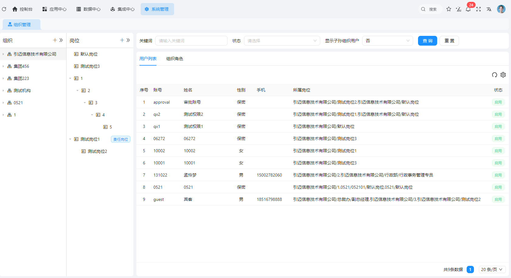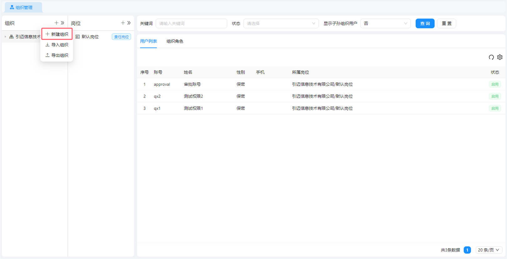 组织管理支持创建多种类型的组织,可以对组织机构及其岗位、岗位下的用户、角色进行管理