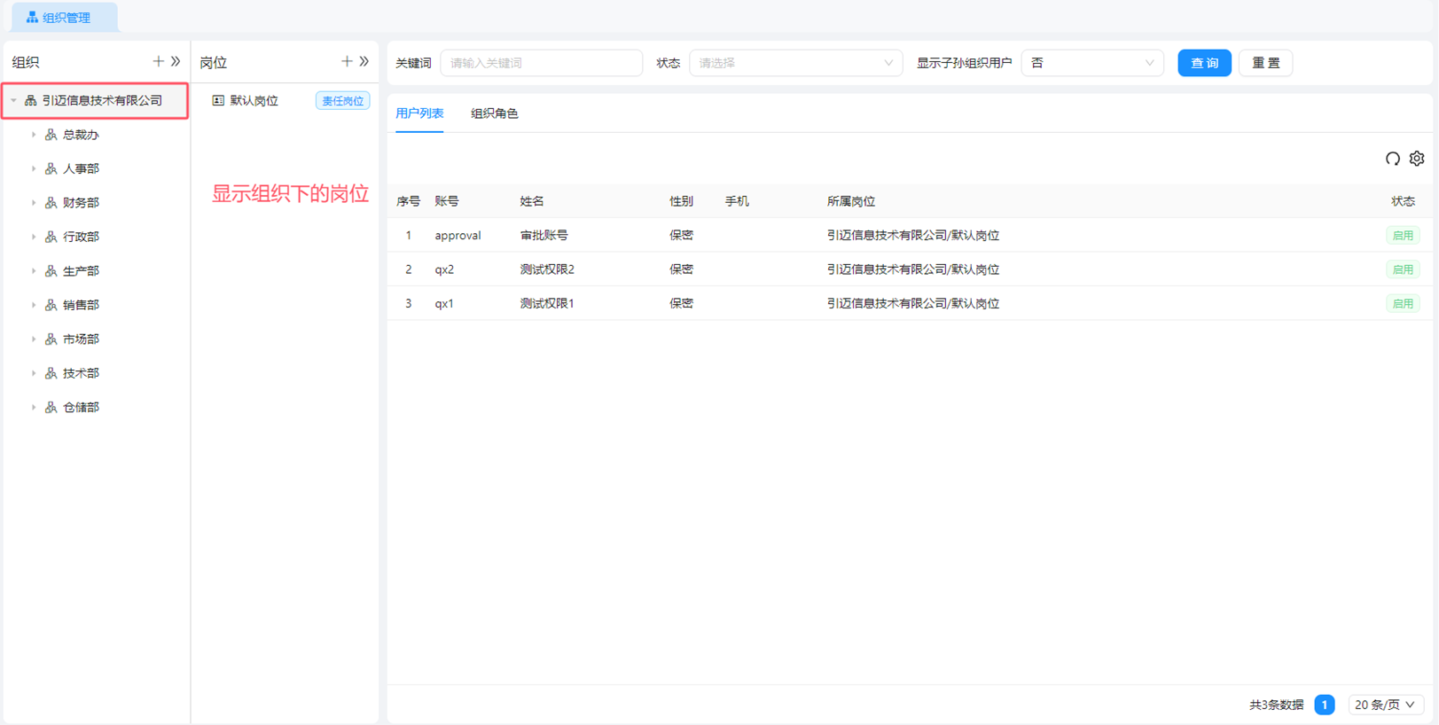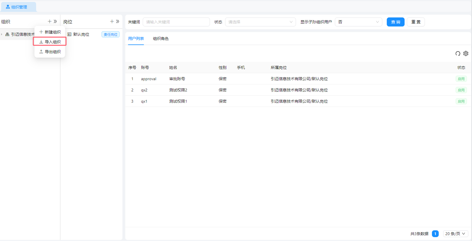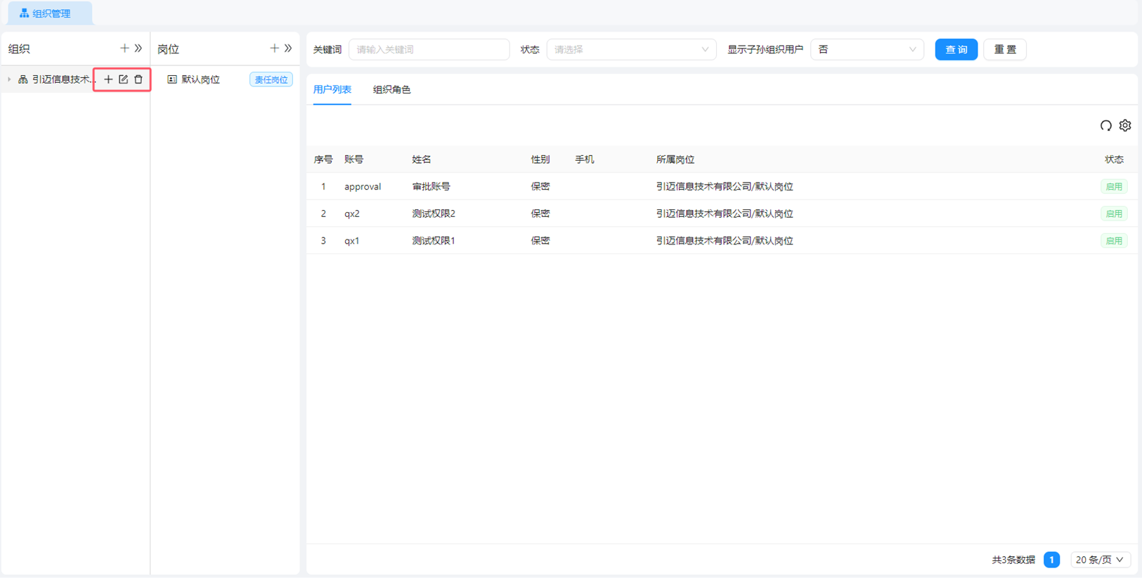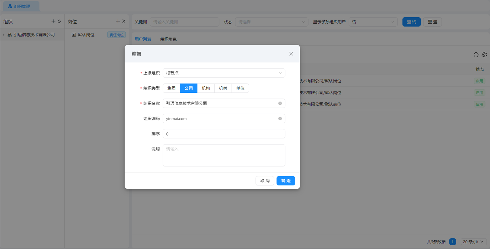 组织管理支持创建多种类型的组织,可以对组织机构及其岗位、岗位下的用户、角色进行管理