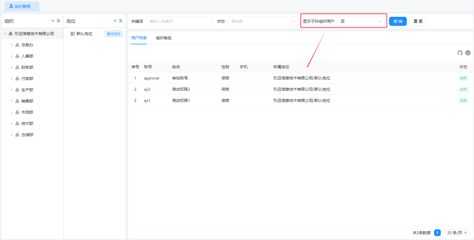 点击组织,若显示子孙组织用户选择否,则右侧用户列表显示选中组织下的直属用户;若显示子孙组织用户选择是,则右侧用户列表显示选中组织下的直属用户及其子孙组织的所有用户