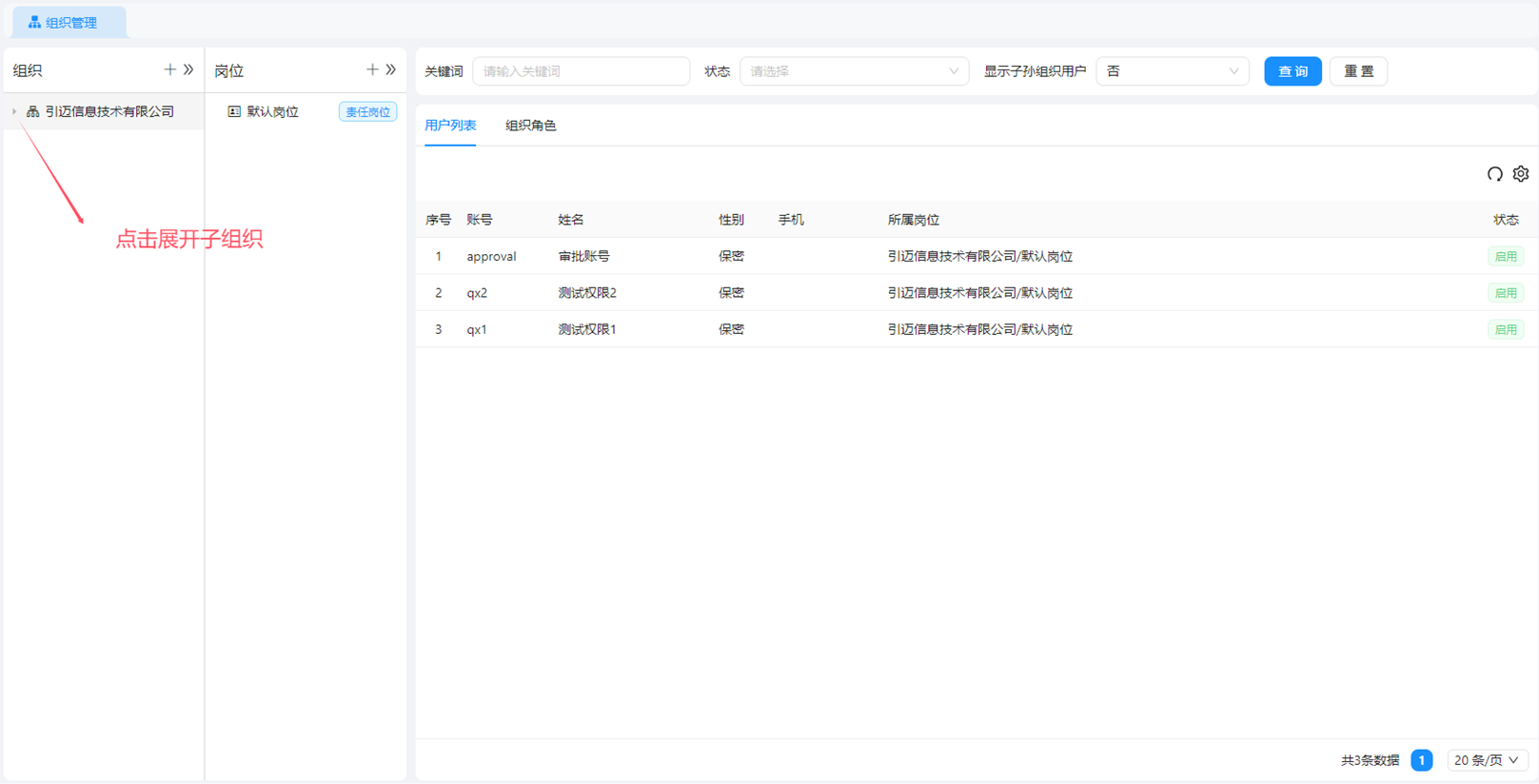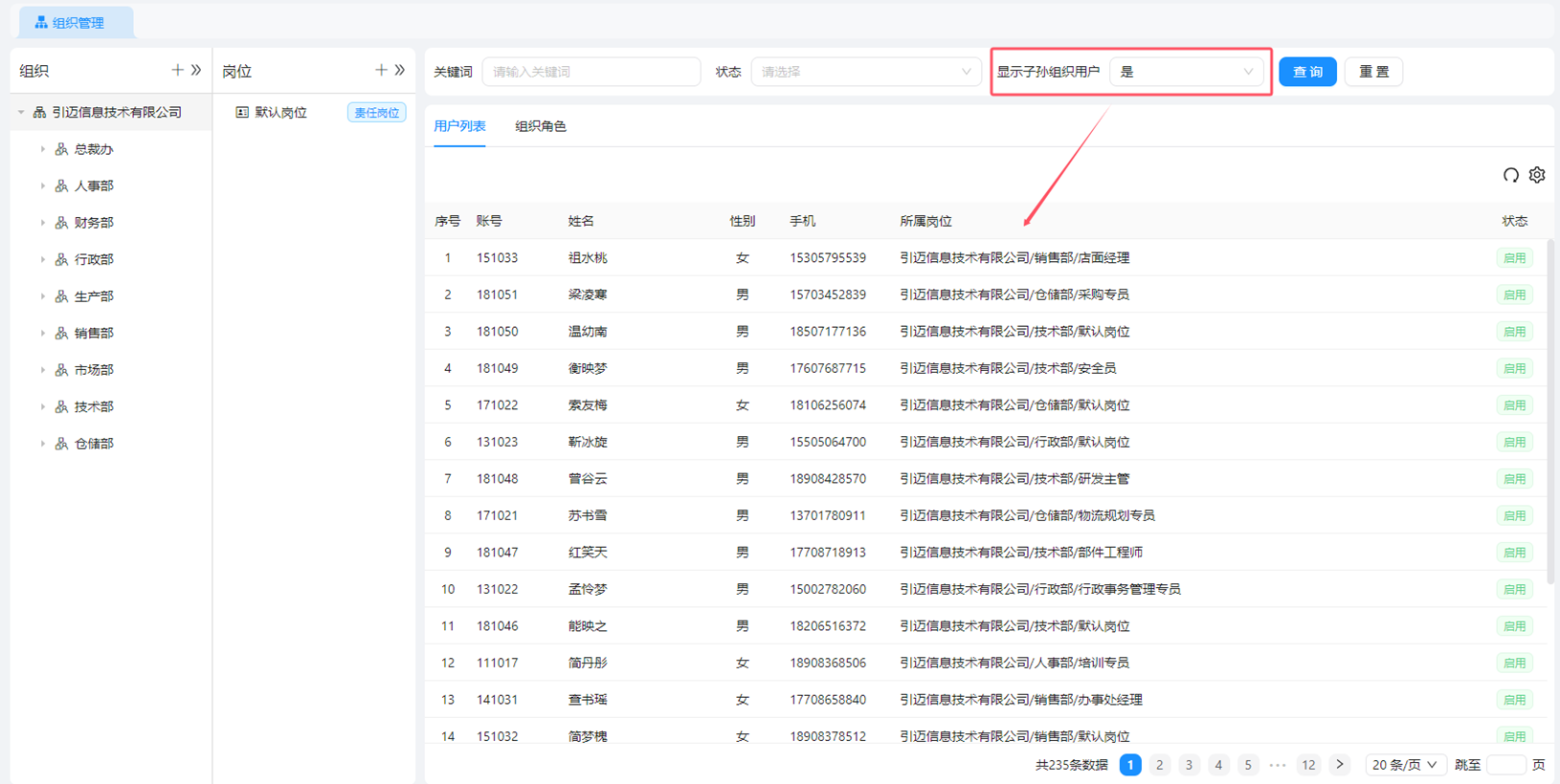 点击组织,右侧岗位列表显示组织下的所有岗位树
