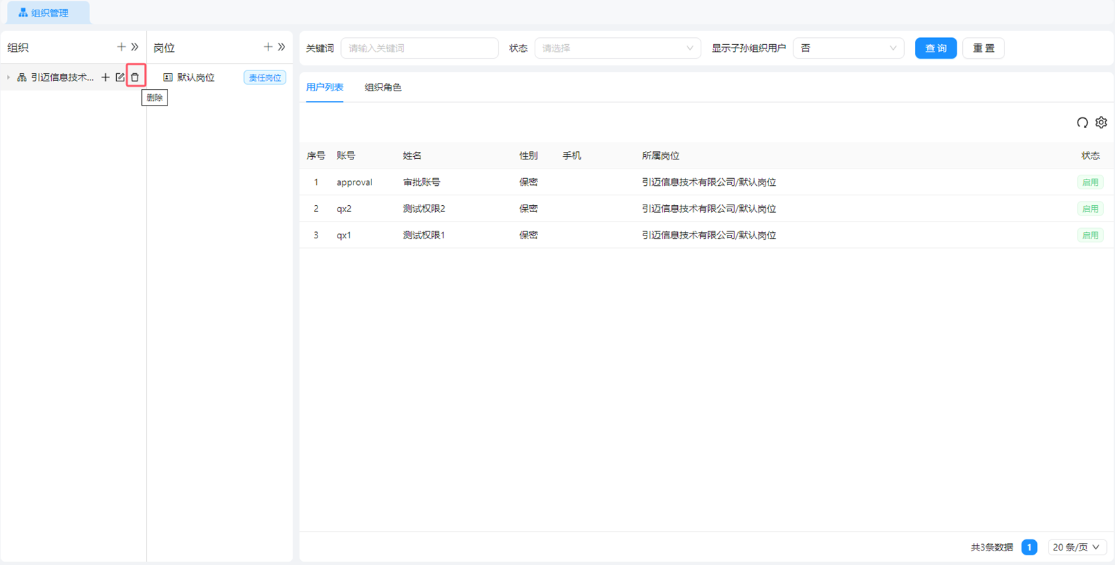 点击删除按钮,若该组织及其子组织下未绑定用户,则该组织及其子组织删除成功;若该组织及其子组织下绑定用户,则删除提示“该组织下存在用户,不可删除”
