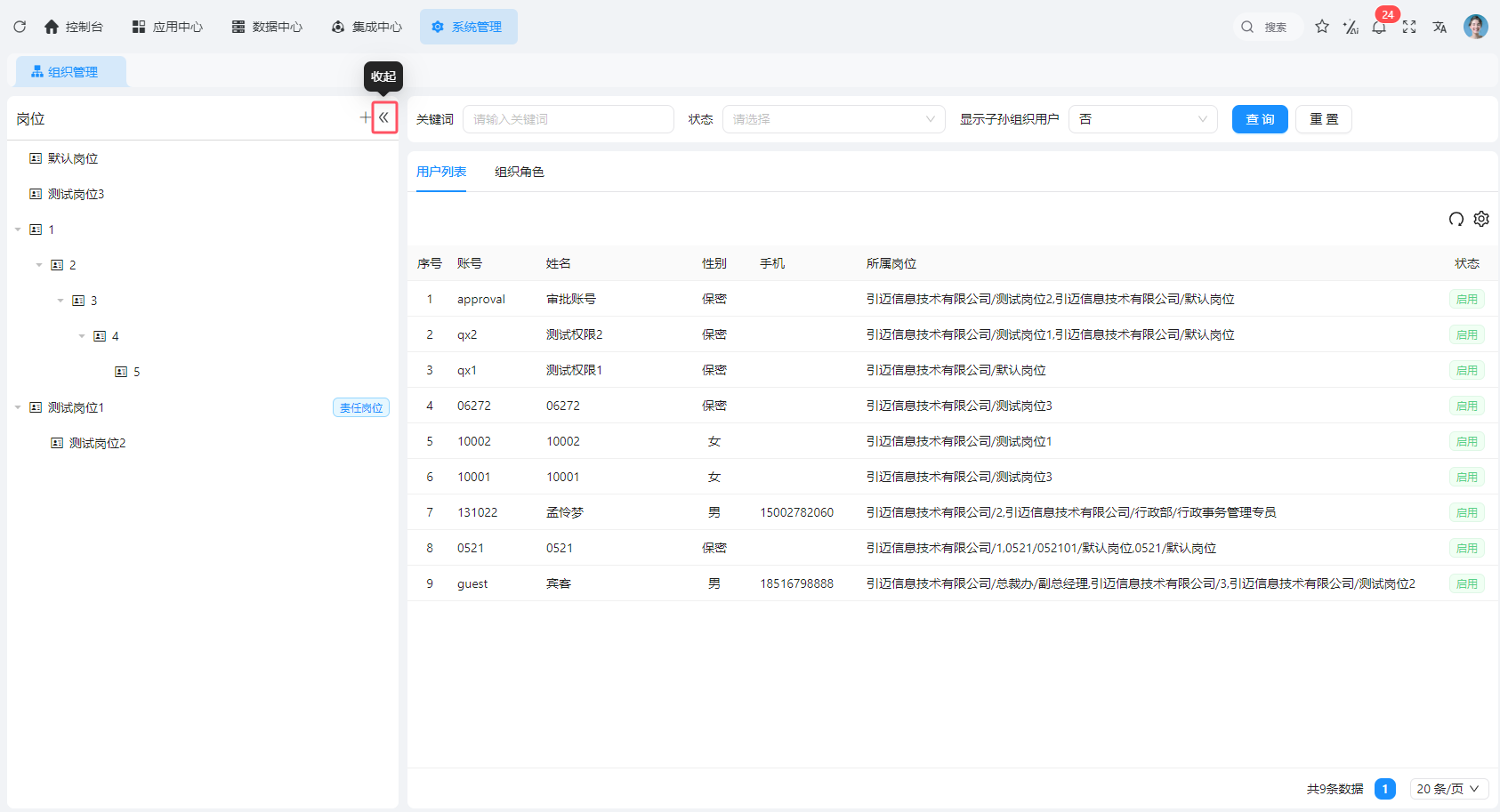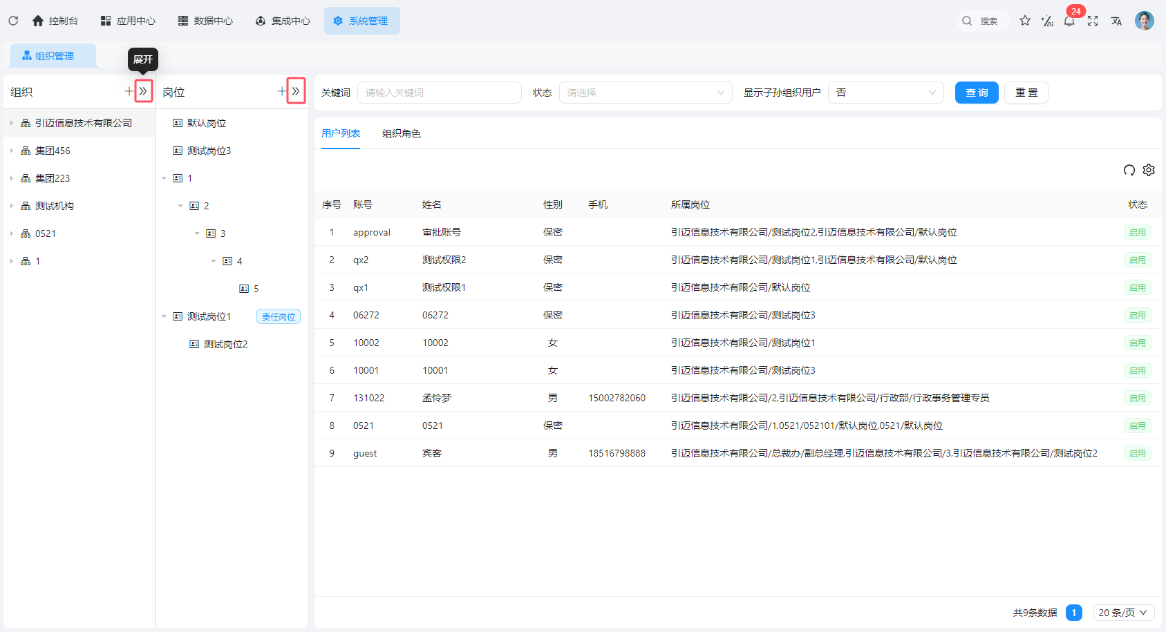 点击展开可展开组织、岗位,更全面的查看组织和岗位层级;点击收起可收起组织列表、岗位列表