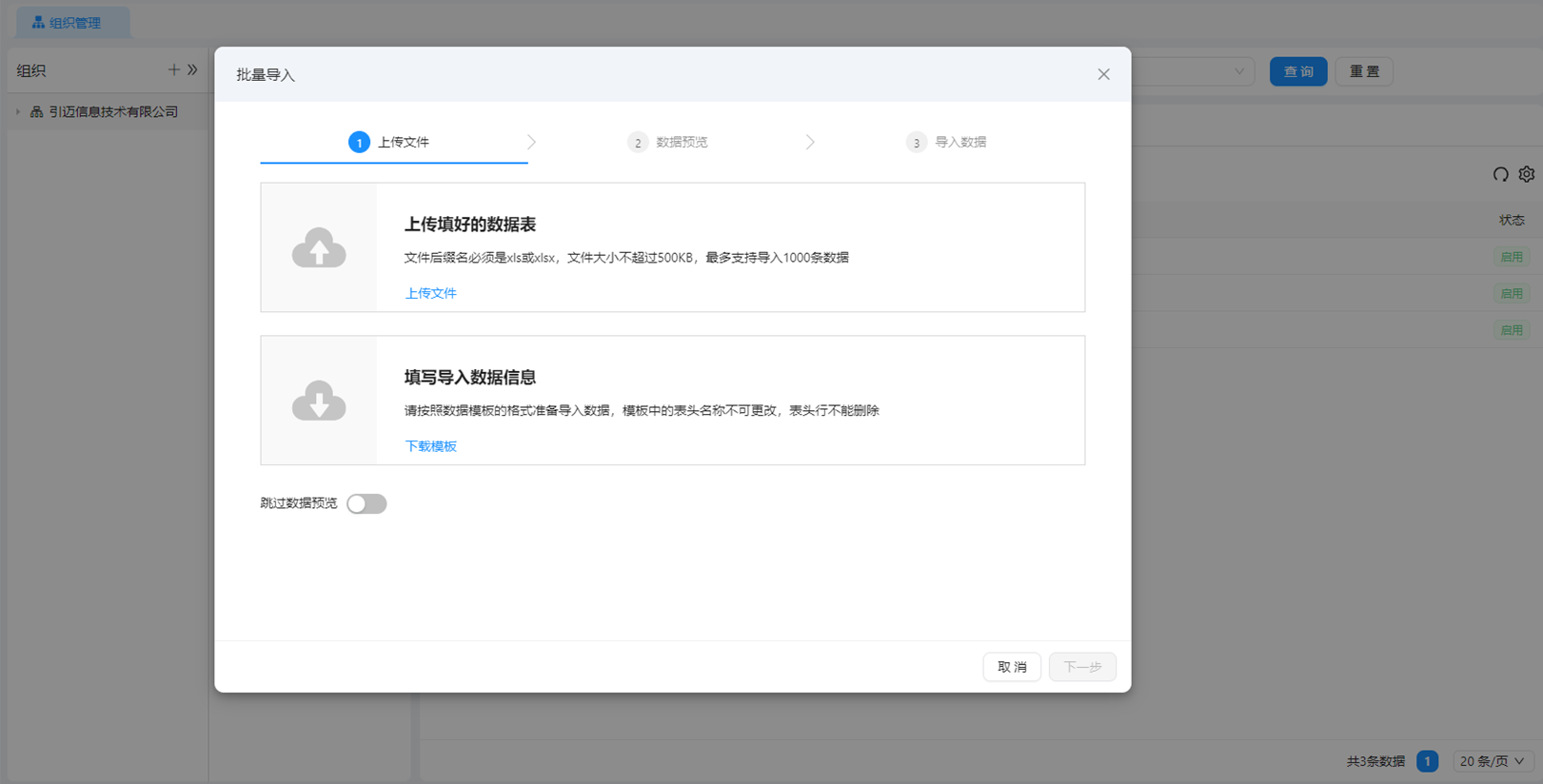 填写好数据表,在批量导入弹窗点击上传文件进行上传。上传文件后,若开启跳过数据预览按钮,点击下一步直接导入数据,不会进入数据预览页面