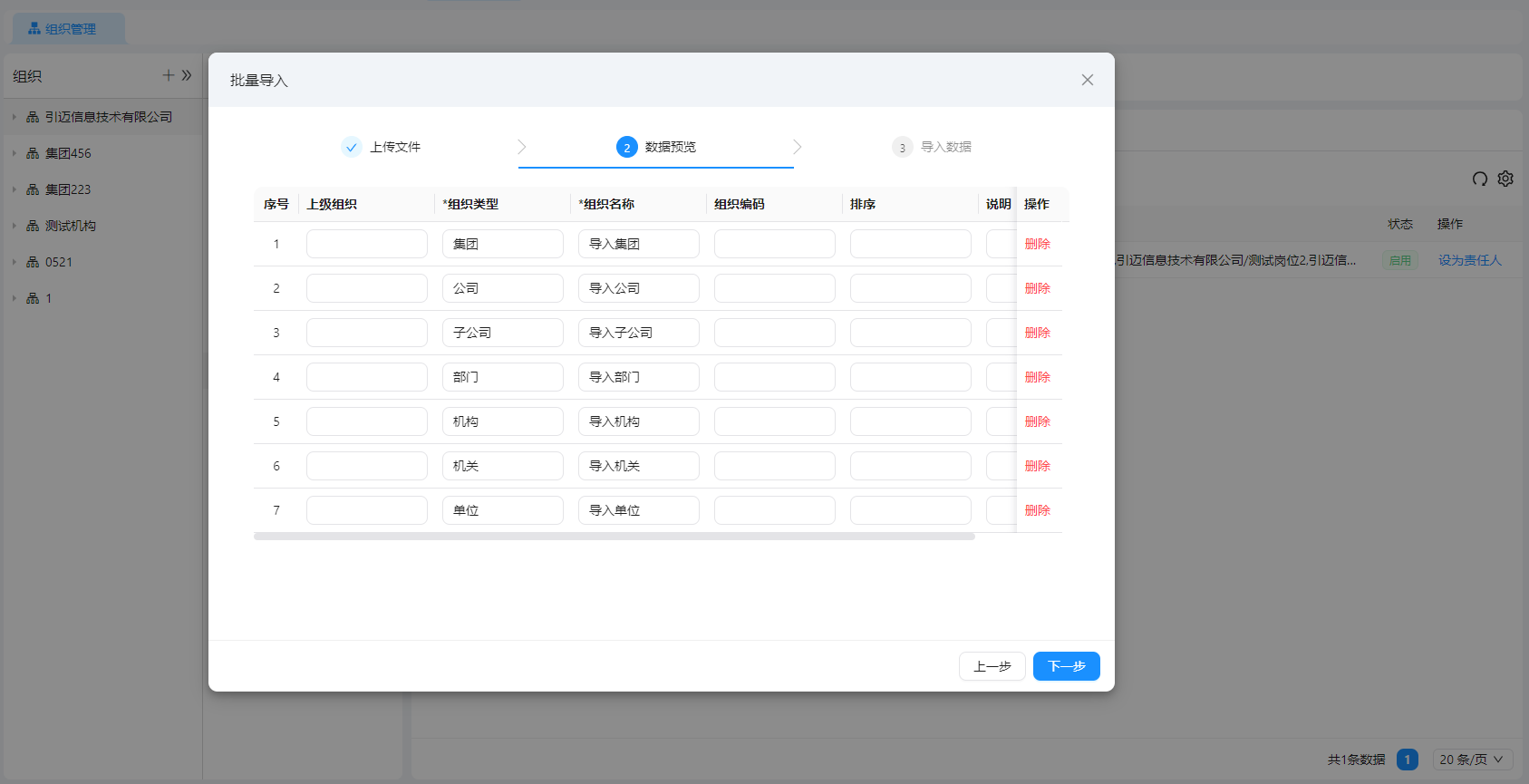 在批量导入弹窗点击下载模板,根据数据模板的格式填写数据可以批量导入组织数据