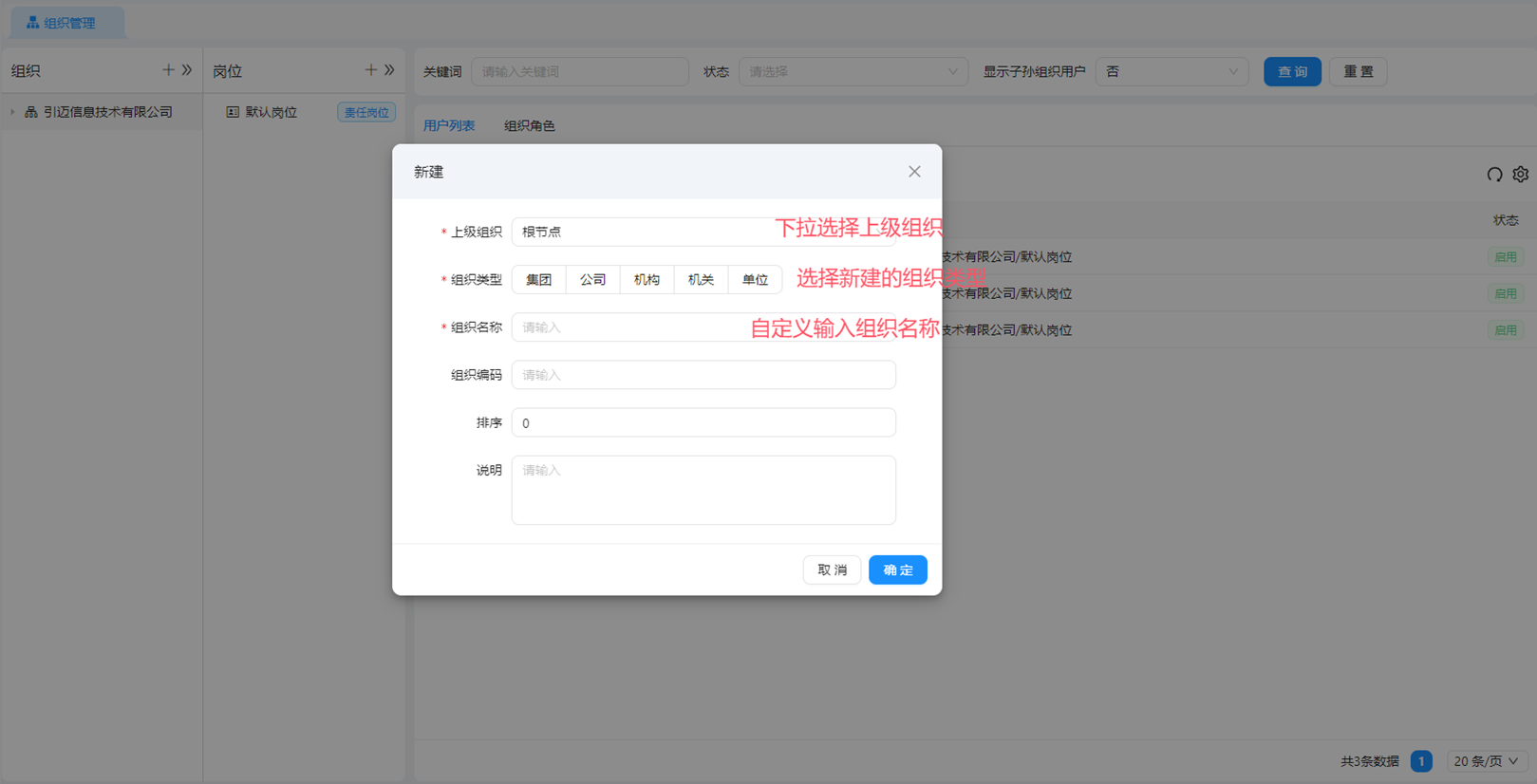 (1)上级组织选择根节点,组织类型可选择集团、公司、机构、机关、单位