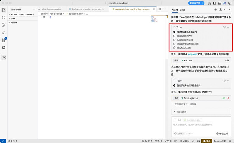 当需求较复杂时,新手易陷入 “写一段调一段” 的低效循环,而 Zulu 联动文心快码 3.5S 的 “多智能体协同” 功能,可突破上下文限制。输入完整需求(如 “开发一个用户登录系统,含手机号验证码登录 + 密码重置”),Zulu 会自动拆解为 “搭建基础登录页面结构→后端模拟 API→前端业务逻辑→添加表单验证和错误处理→测试和优化功能” 五步。