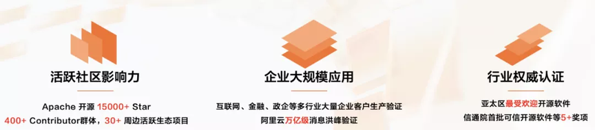 回顾 RocketMQ 发展的十余年,良好的社区环境和商业支持使得大量企业开发者可以很方便的跟进业务特点和诉求进行选型和验证。在社区活跃影响力方面,RocketMQ 社区项目收获 15000+Star,活跃的贡献者有 400+ 位,多语言、生态连接等周边活跃项目 30+ 个,深受社区开发者欢迎。在应用规模方面,RocketMQ 作为金融级业务消息方案,积累了互联网游戏、在线教育、金融证券、银行、政企能源、汽车出行等众多行业数以万计的企业客户。同时,在阿里巴巴内部担负业务核心链路,每天流转万亿级消息流量,扛过了历届双十一的零点峰值。在行业评测方面,RocketMQ 也多次斩获大奖。