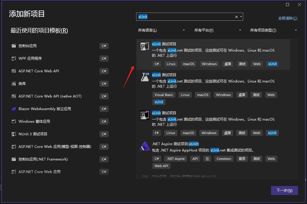 因为 xUnit 框架与 Visual Studio 是兼容的,我们可以直接在 Visual Studio 中搜索:xUnit 测试项目
