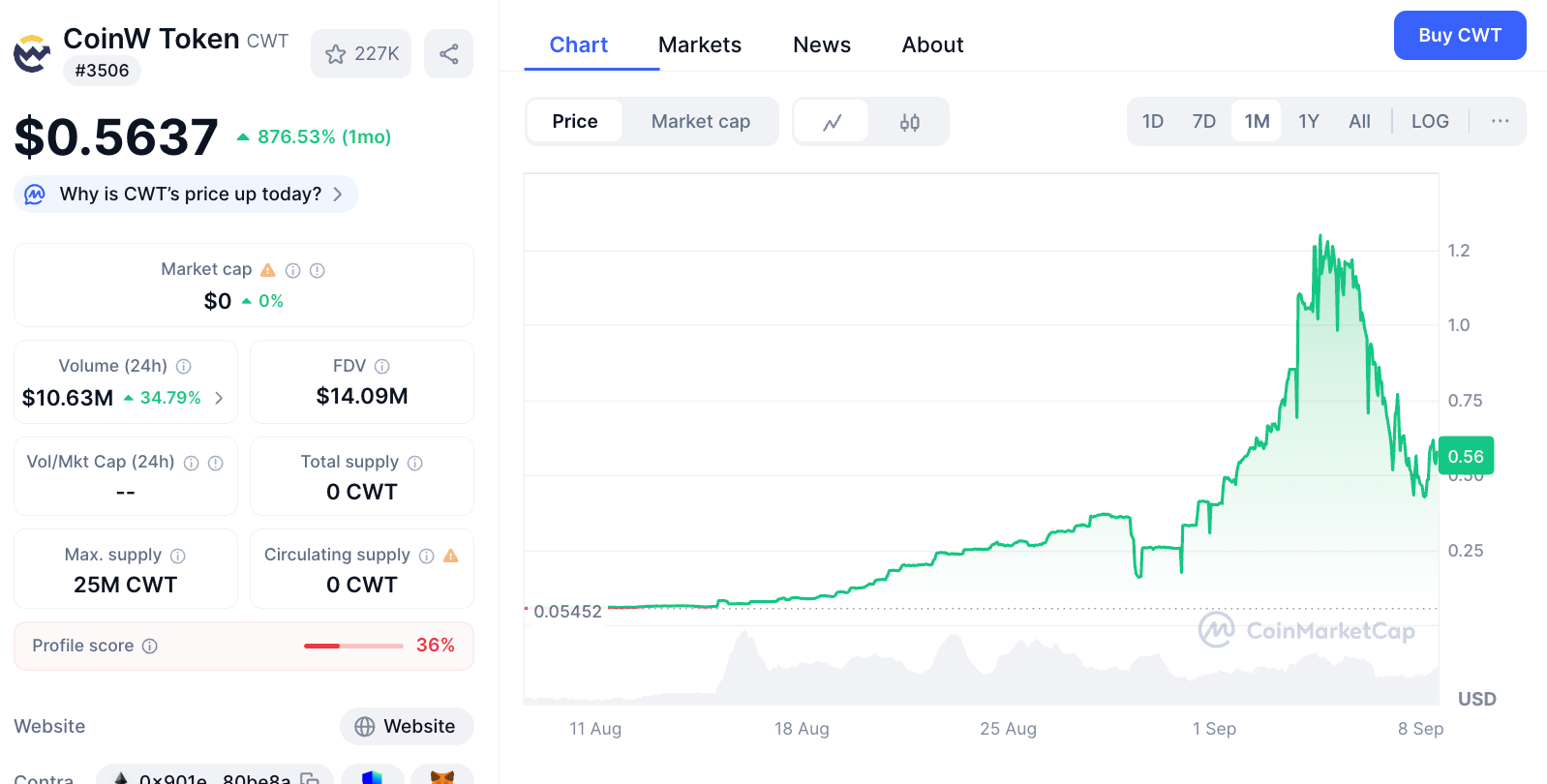 另一面,DeriW 母生态 CoinW 的快速扩张也在同步推高预期。其平台代币 CWT 近期创下 1.32 美元历史新高,单月涨幅超过 20 倍,为 DeriW 的叙事提供了强有力的背书。