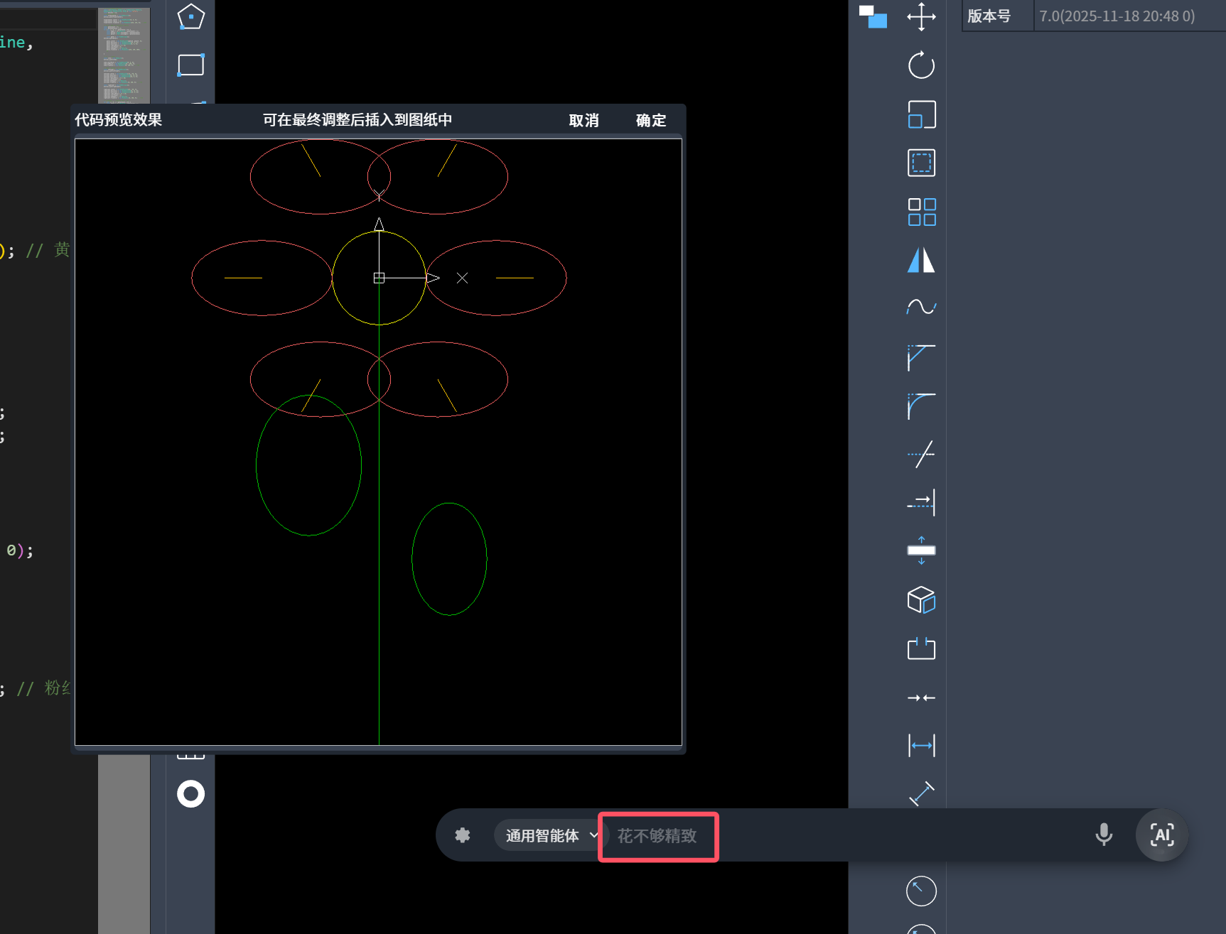 等待一会儿, 就把代码生成出来给你看,并且还有预览效果,如果满意的话点击确认就可以把这朵花插入到图元中了。如果不满意,我们可以继续与 AI 对话进行修改,如下图: