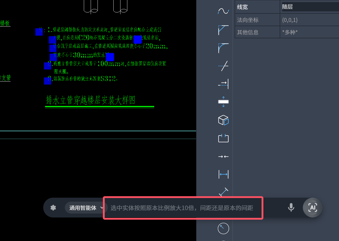 以上演示的是建模智能体的能力,而通用智能体的能力,目前主要是用于操作一些实体。比如:"选中实体按照原本比例放大 10 倍,间距还是原本的间距"