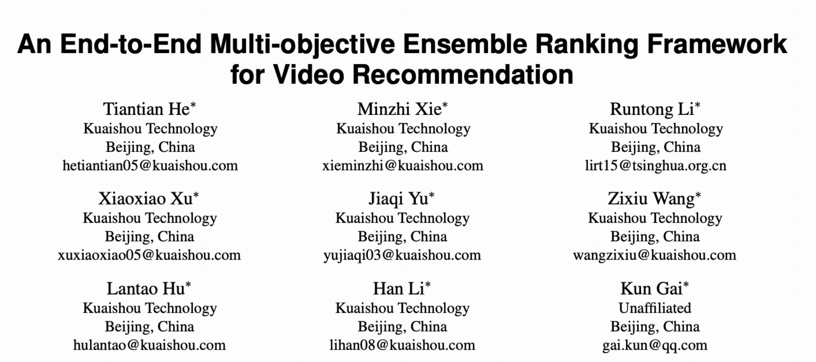 论文题目:An End-to-End Multi-objective Ensemble Ranking Framework for Video Recommendation