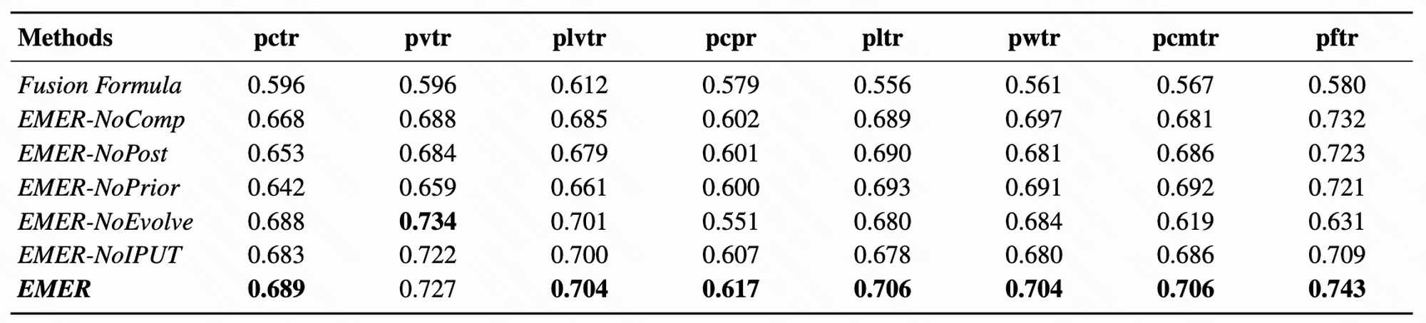实验结果显示,移除任一信号均导致性能下降,表明两类信号在模型训练中均发挥重要作用。其中,EMER-NoPrior 的性能衰退更为显著。