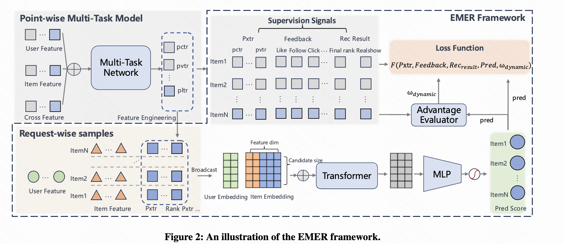 样本组织: 传统方法只看用户互动过的少数几个 item。但我们知道,用户的一次请求中,其实有大量候选 item。EMER 是把一次请求的所有候选 item(无论是否曝光)都打包成一个样本。这不仅能解决曝光偏差问题,还直接为模型提供了丰富的比较对象,并且与在线对所有候选的比较排序过程更加一致。